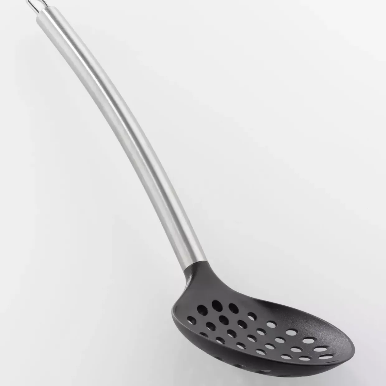 Kunststoffelemente am Griff bieten zusätzlichen Halt und machen den Schaumlöffel angenehm in der Handhabung. Der konventionelle Stil dieses Küchenhelfers fügt sich nahtlos in jede Kücheneinrichtung ein, während die dezente Farbgebung in Edelstahl und Schwarz zeitlose Eleganz versprüht.
