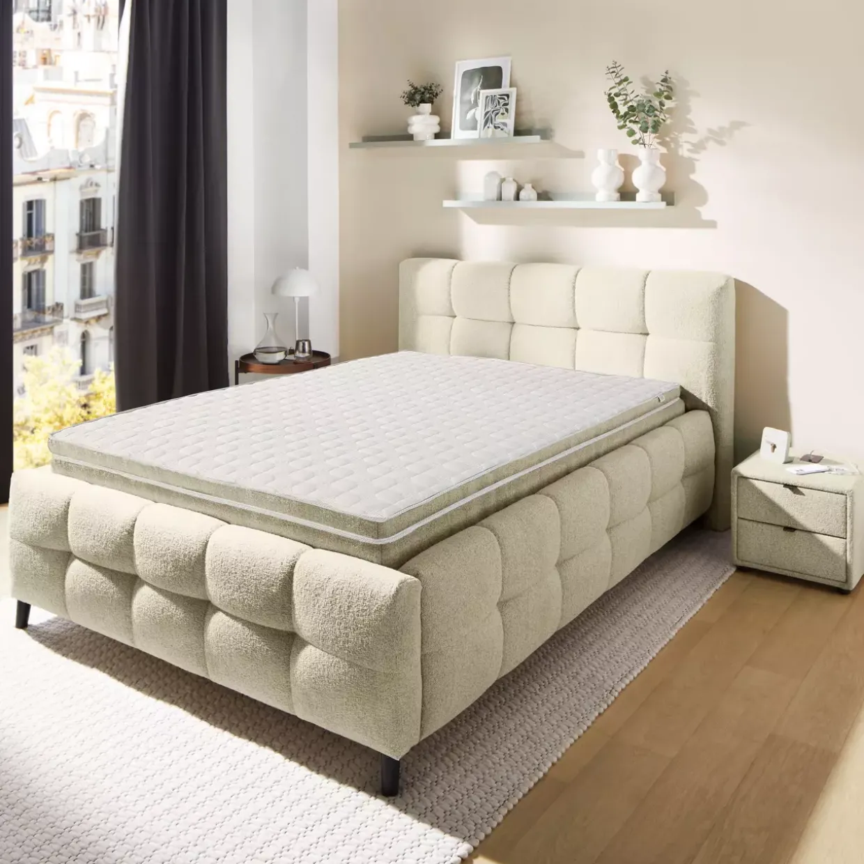 Eingebettet in eine elegante „Bubble-Optik“, bietet das Polsterbett Lucy nicht nur visuelle Anreize, sondern auch funktionalen Komfort. Der beige Stoff in Kombination mit robustem Metall verleiht dem Bett eine zeitlose Eleganz und Stabilität.