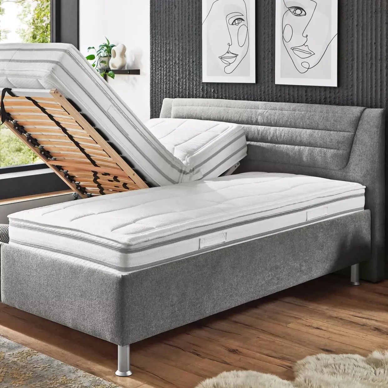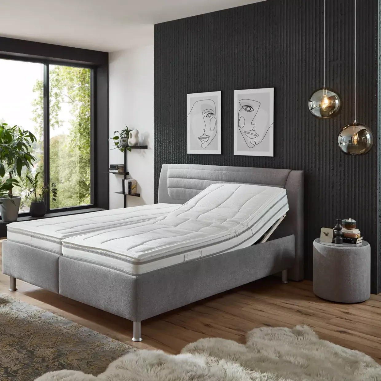 Mit einer beeindruckenden Kopfteilbreite von 192 cm setzt das Modell Luvara neue Maßstäbe im modernen Stil. Diese Polsterausführung besticht durch ihre stilvolle Kombination aus Stoff und Kunststoff, die eine harmonische Verbindung von Komfort und Eleganz schafft. Die Farbpalette in Silber, Alu und Silberfarben unterstreicht das ästhetische Design und fügt sich nahtlos in jedes zeitgemäße Interieur ein.Ein durchdachtes Detail ist der glatte Unterbau mit einer gelochten Bodenplatte, die eine Höhe von 29 cm aufweist. Diese Konstruktion sorgt für Stabilität und Langlebigkeit. Die runde Fußform des Luvara-Modells verleiht dem Ganzen eine subtile Raffinesse, die nicht nur funktional, sondern auch optisch ansprechend ist.Besonderen Wert legt dieses Produkt auf individuellen Komfort. Die linke Matratze mit Härtegrad H2 und die rechte Matratze mit Härtegrad H3 bieten eine personalisierte Liegefläche, die auf die unterschiedlichen Bedürfnisse der Nutzer eingeht. Diese sorgfältig ausgewählten Eigenschaften machen das Polster zu einer idealen Wahl für diejenigen, die Qualität und Design zu schätzen wissen.Insgesamt vereint dieses Produkt moderne Ästhetik mit funktionalen Details, die in jedem Wohnraum für ein stilvolles Ambiente sorgen. Entdecken Sie die Vorzüge und lassen Sie sich von der eleganten Einfachheit des Luvara-Modells inspirieren.