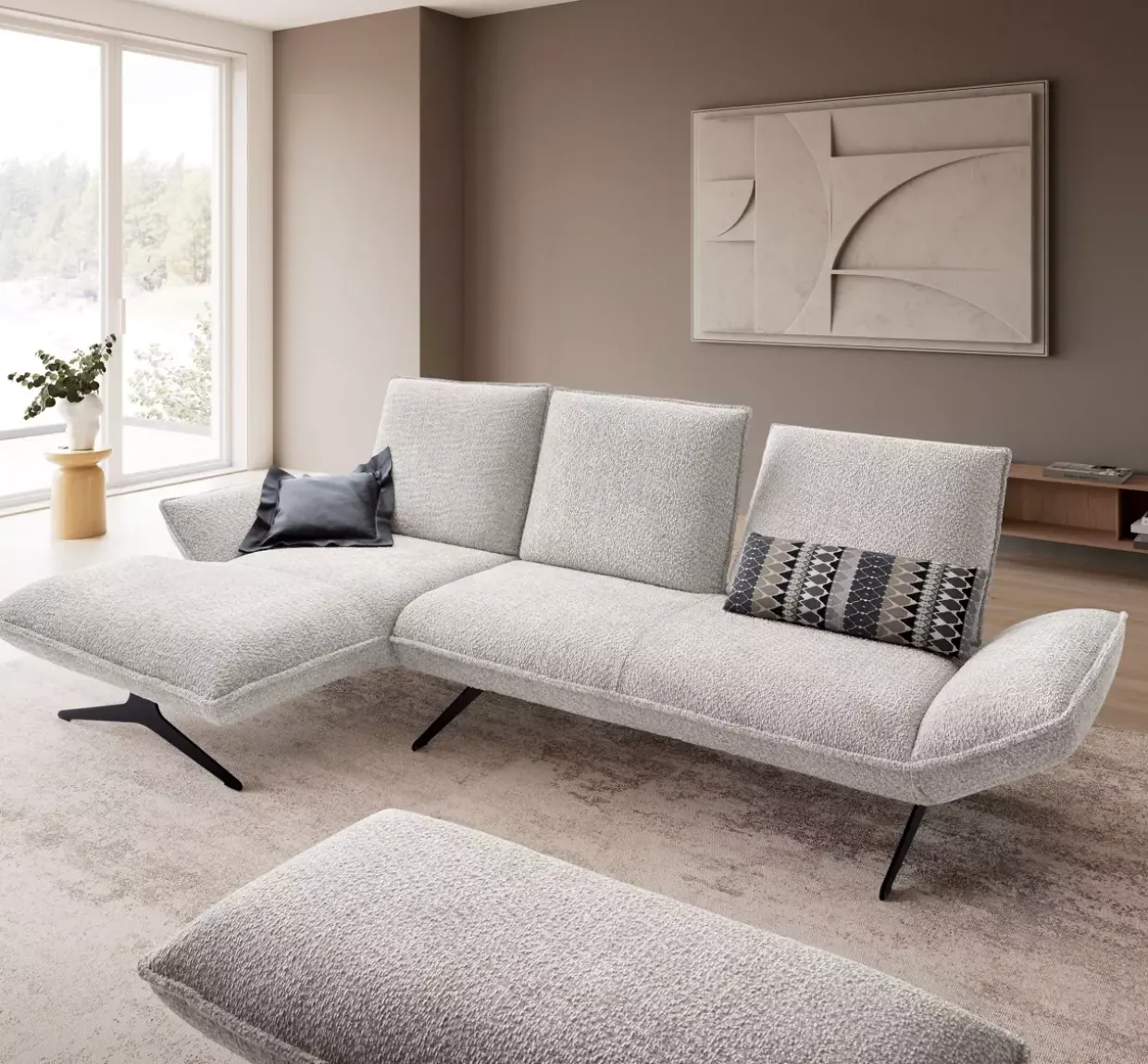 Bitte beachten Sie bei der Pflege, dass die Lehnen mit Rasterbeschlägen nicht in hochgestelltem Zustand als Sitz verwendet werden sollten, um die Langlebigkeit des Mechanismus zu gewährleisten. Diese Polstergarnitur vereint Komfort und Funktionalität und fügt sich harmonisch in moderne Wohnlandschaften ein. Ein Möbelstück, das durch Qualität und durchdachte Funktionen überzeugt.