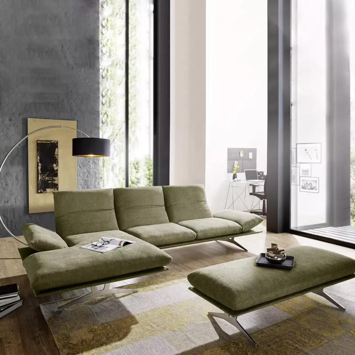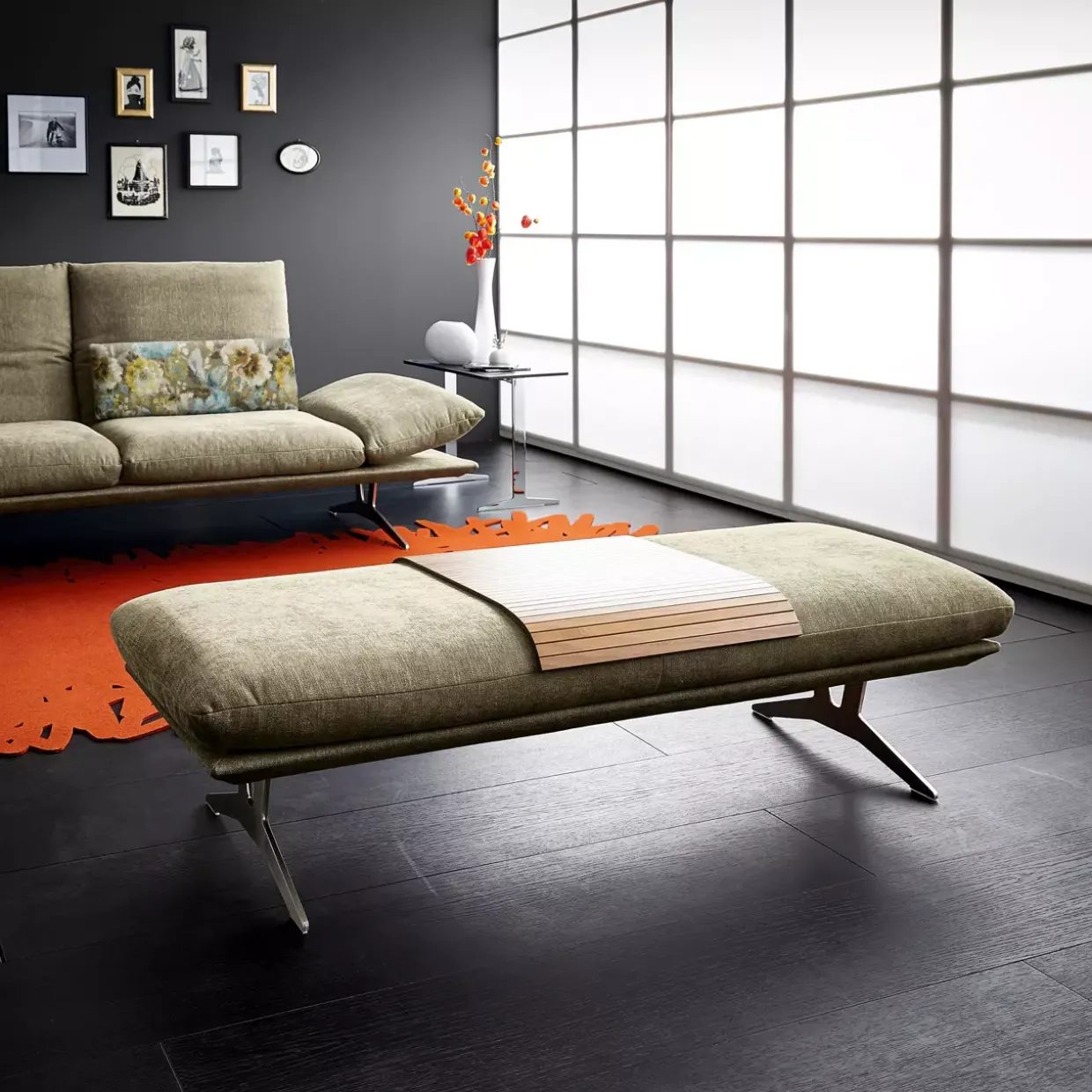 Die zeitgemäße Farbgebung in Impression oliv und Nickel satiniert fügt sich nahtlos in moderne Wohnkonzepte ein. Das designorientierte Kufenfußgestell unterstreicht den zeitlosen Stil. Besonders bemerkenswert ist die Möglichkeit, den Funktionsrücken umzuklappen, wodurch sich die Gesamthöhe um bis zu 20 cm verringert und die Tiefe um bis zu 31 cm vergrößert.