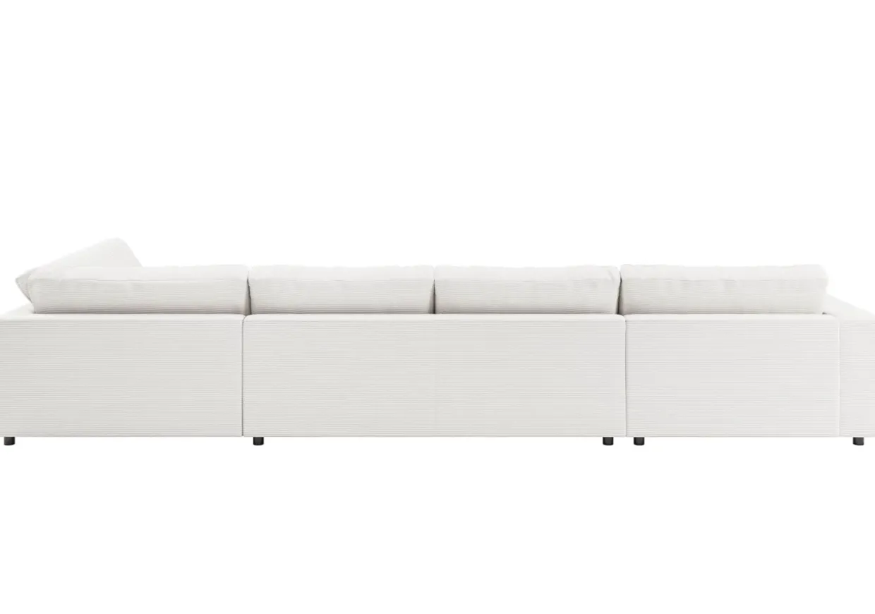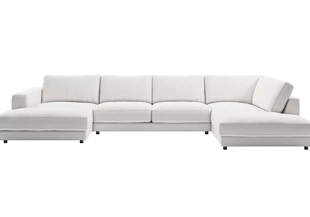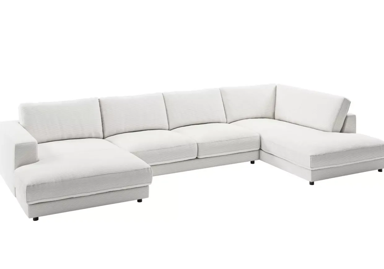 Ein weiteres Highlight ist der hochwertige Cordstoff, der durch seine robuste Struktur und angenehme Haptik überzeugt. Der Stoff ist frei von Mustern und Motiven und sorgt für eine ruhige und klare Optik. Besonders hervorzuheben ist, dass die Rückseite echt bezogen ist, was die Polstergarnitur freistellbar macht und somit vielseitige Platzierungsmöglichkeiten bietet.