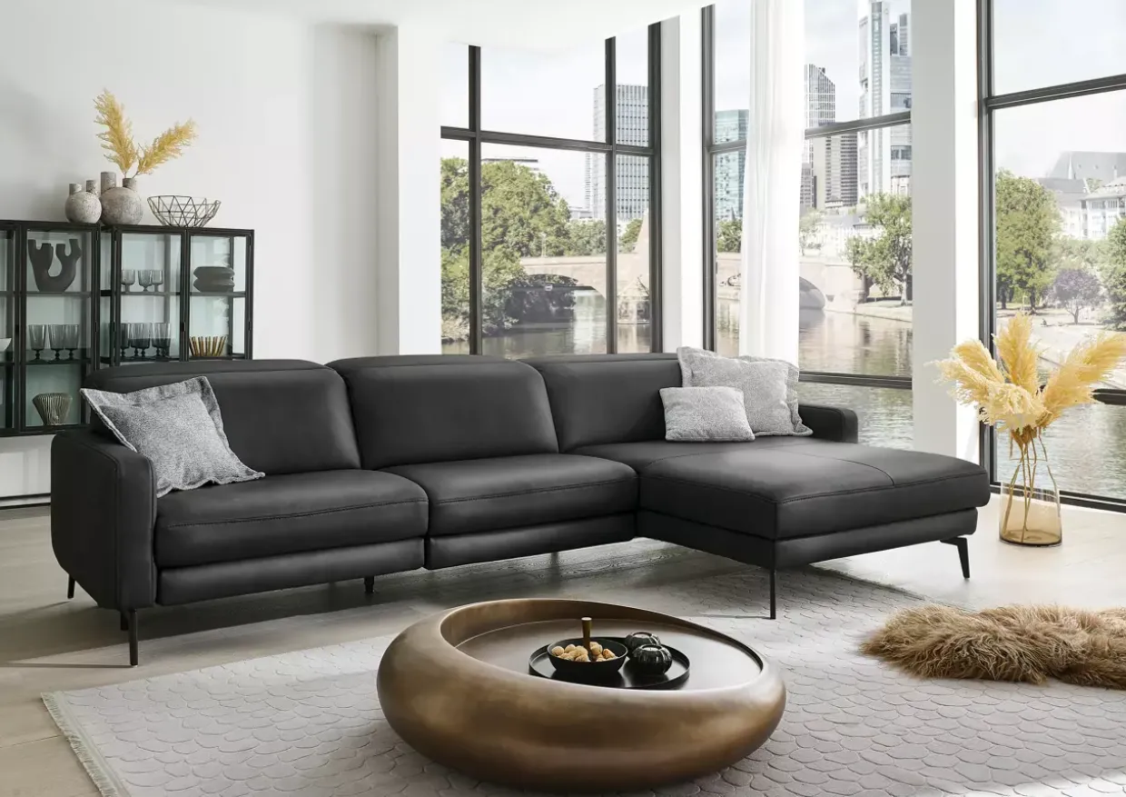 Gefertigt aus edlem Leder und robustem Metall, vereint diese Garnitur luxuriöse Materialien zu einem harmonischen Gesamtbild. Die legere Polsterung sowie der Federkern sorgen für ein angenehmes Sitzgefühl, das auch nach langen Stunden nicht nachlässt. Die anthrazitfarbene Lederoberfläche verleiht dem Möbelstück einen Hauch von zeitloser Eleganz, während der Echtbezug im Rückenbereich die Hochwertigkeit unterstreicht.