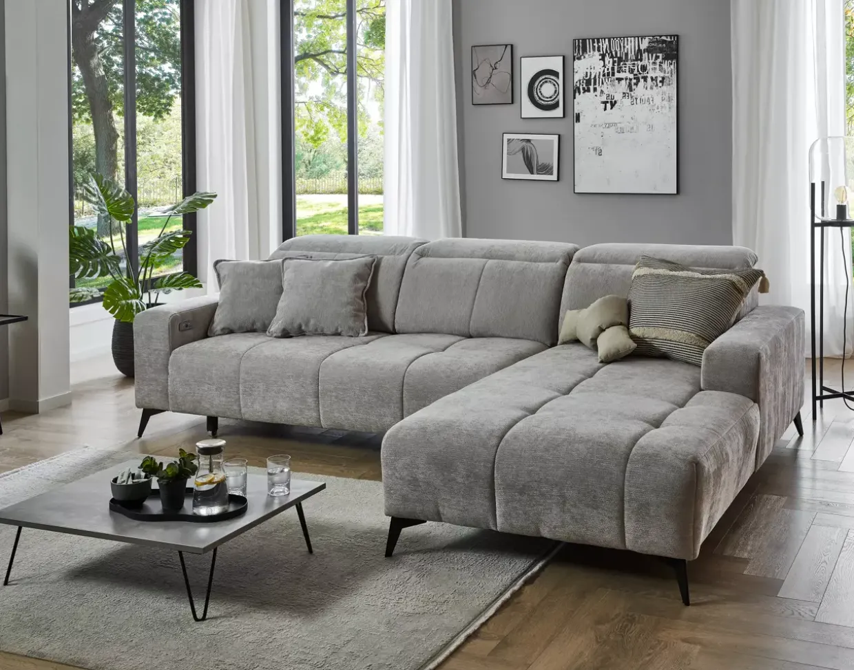 Eleganz trifft Funktionalität: Die Porto Polstergarnitur vereint schlichtes Design mit durchdachten Funktionen. Eine elektrische Sitztiefenverstellung ermöglicht es Ihnen, die Tiefe bis zu beeindruckenden 60 cm anzupassen, sodass jeder Sitzplatz individuell auf Ihre Bedürfnisse abgestimmt werden kann.