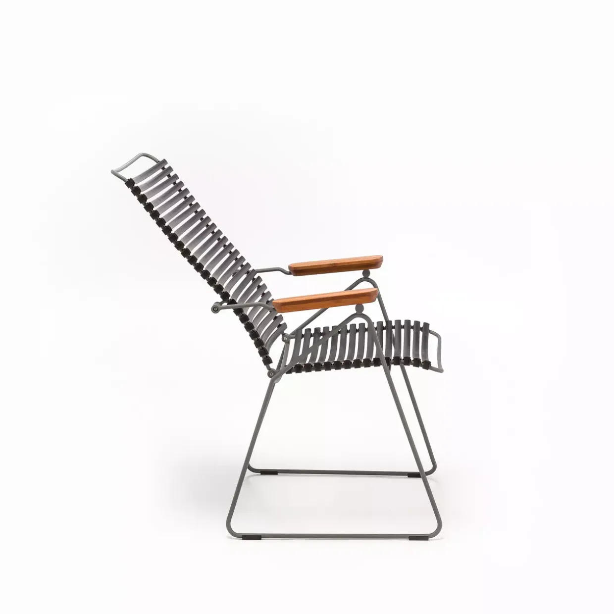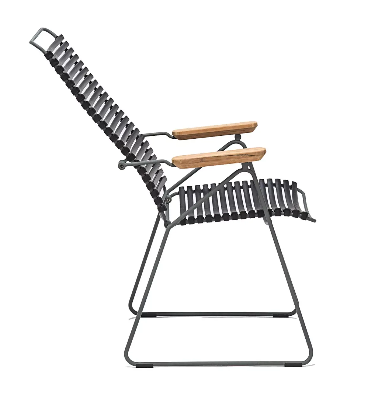 Ein stilvolles Design prägt den modernen Positions-Stuhl, der mit seiner grauen Farbgebung in jede Umgebung passt. Die pulverbeschichtete Oberfläche verleiht dem Stuhl nicht nur eine ansprechende Optik, sondern sorgt auch für Langlebigkeit und Schutz vor äußeren Einflüssen. Die Kombination aus Kunststoff, Metall und Holzwerkstoff schafft ein harmonisches Zusammenspiel von Materialien, das durch die Verwendung von robustem Stahl zusätzlich verstärkt wird.Besondere Aufmerksamkeit verdient die Relaxfunktion dieses Stuhls. Die verstellbare Rückenlehne ermöglicht es Ihnen, Ihren Sitzkomfort individuell anzupassen und Momente der Entspannung zu genießen. Die stilvollen Armlehnen aus Bambus bieten dabei eine natürliche Haptik und fügen sich nahtlos in das Gesamtdesign ein. Ein weiteres Highlight sind die schwarzen Kunststoff-Lamellen, die sowohl Sitzschale als auch Rücken zieren. Diese sind nicht nur ästhetisch ansprechend, sondern auch UV- und witterungsbeständig. Sollten Sie Abwechslung wünschen, sind die Lamellen austauschbar und in weiteren Farben erhältlich.Der Stuhl mit Kufenfußform bietet nicht nur Stabilität, sondern auch eine moderne Ästhetik, die im Innen- und Außenbereich überzeugt. Genießen Sie einen Sitzplatz, der Funktionalität mit einem Hauch von Luxus verbindet.
