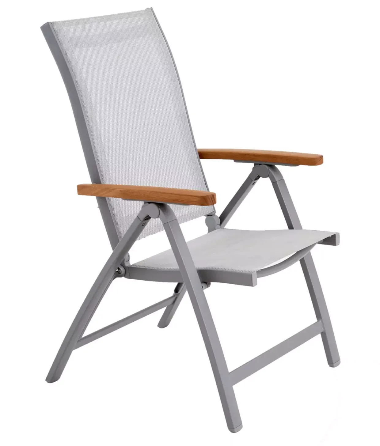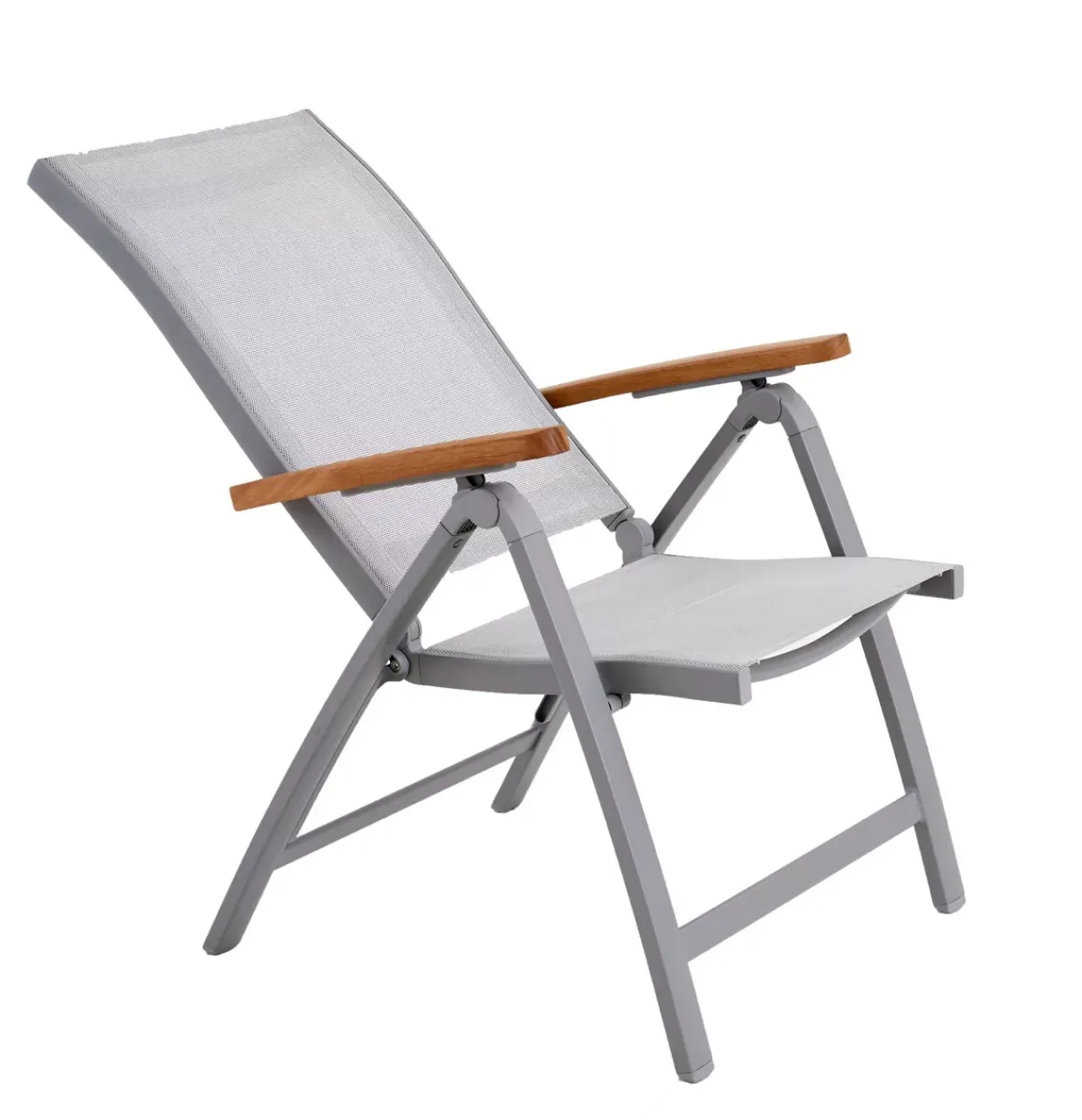 „Sylt“ Multipositionsstuhl; Größe: 62 x 71 x 107 cm; Gestell Aluminium hellgrau lackiert (ALU SGY), ; Sitz/Rücken Weathernet 2/1 platinfarben (WNT 2/1 PLT), Textilene 100% Polyester; Armlehnen FSC-Eukalyptusholz 2-fach teakfarben lackiert (PAR FSC LOT); Sitzbreite: 47 cm;