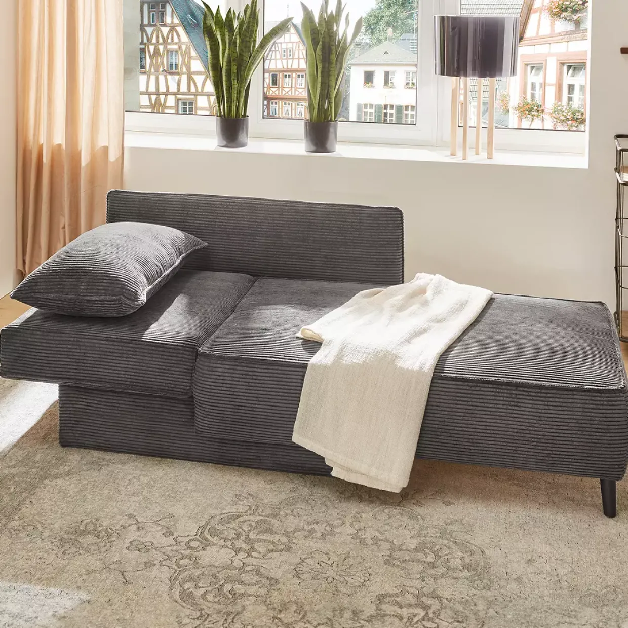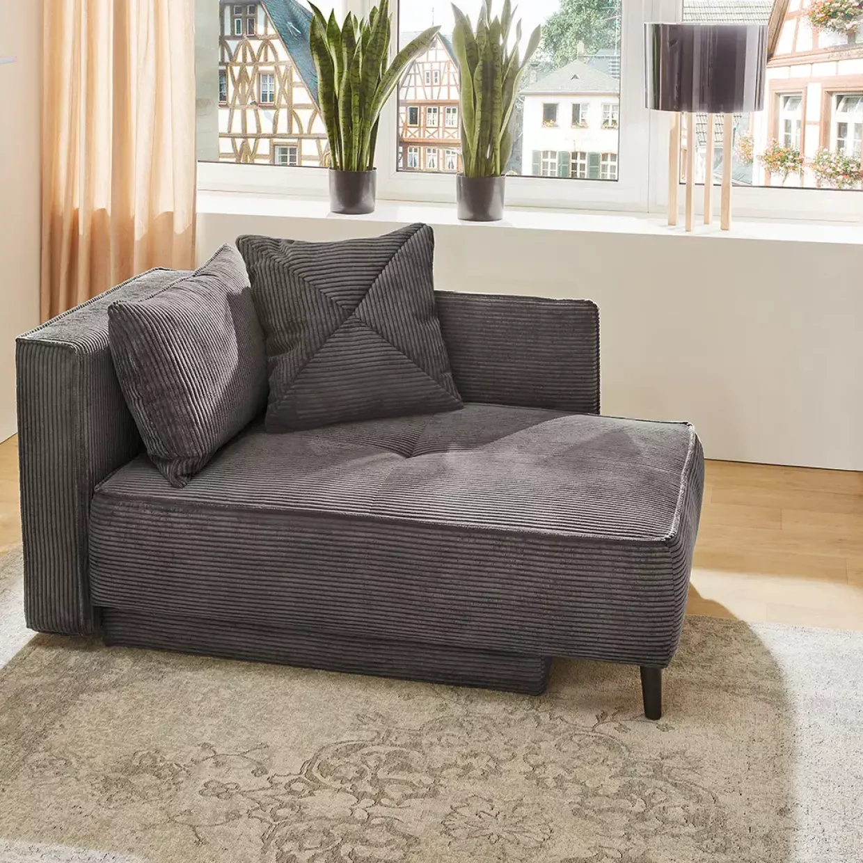 Flexibilität wird bei dieser Recamiere großgeschrieben: Sie lässt sich sowohl links als auch rechts montieren, was Ihnen die Freiheit gibt, sie optimal in Ihre Wohnlandschaft zu integrieren. Der Rücken ist echt bezogen, was bedeutet, dass die Recamiere auch frei im Raum platziert werden kann, ohne an Ästhetik zu verlieren. Ein weiteres Highlight ist der integrierte Bettkasten, der Ihnen zusätzlichen Stauraum bietet. Ob für Decken, Kissen oder andere Accessoires – hier finden Sie den Platz, den Sie benötigen, um Ihr Zuhause aufgeräumt und stilvoll zu gestalten.
