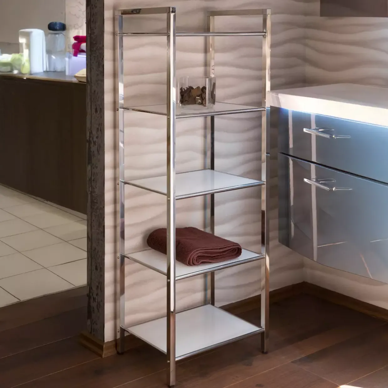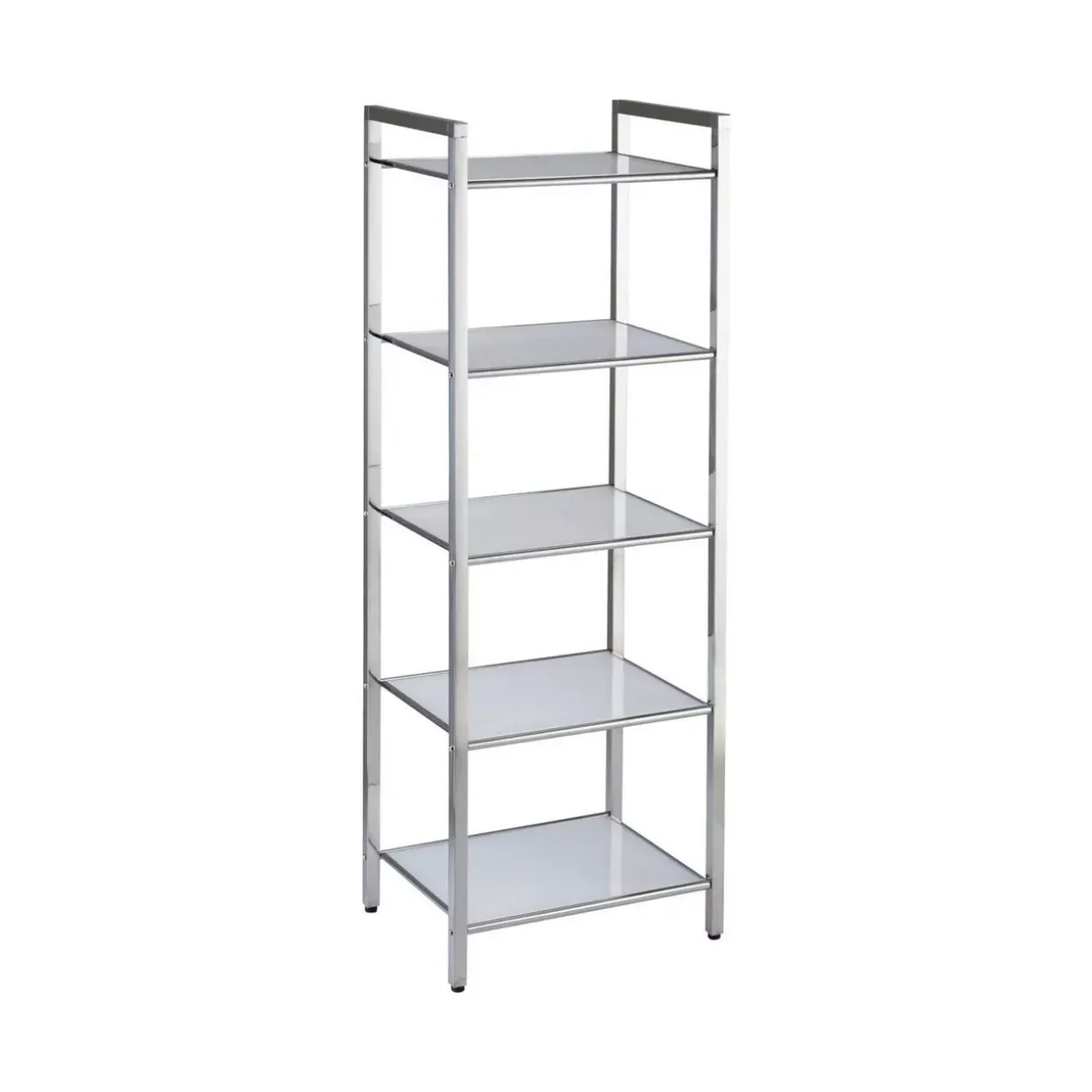 In zeitlosem Retro-Stil präsentiert sich dieses Regal, das mit seiner klaren weißen Farbgebung in jedem Raum Akzente setzt. Die Kombination aus Metall und Glas verleiht dem Möbelstück nicht nur Stabilität, sondern auch eine elegante Transparenz, die es zu einem besonderen Blickfang macht. Edelstahl bildet das robuste Gerüst des Regals und sorgt für Langlebigkeit und eine moderne Anmutung. Die hinterlackierte Oberfläche unterstreicht den hochwertigen Charakter und schützt das Metall vor äußeren Einflüssen. So fügt es sich nahtlos in verschiedene Einrichtungsstile ein und bleibt dabei stets ein stilvolles Element.Mit einer Anzahl von fünf Einheiten bietet das Regal ausreichend Platz, um Ihre Lieblingsstücke stilvoll zu präsentieren oder alltägliche Gegenstände griffbereit zu verstauen. Die Glasböden tragen zur Leichtigkeit des Designs bei und lassen das Regal trotz seiner Stabilität schwebend wirken.Dieses Möbelstück ist nicht nur funktional, sondern auch ein Ausdruck von Geschmack und Qualität. Es passt sowohl in Wohnräume als auch in Arbeitsumgebungen und kann je nach Bedarf flexibel eingesetzt werden. Entdecken Sie die Vielseitigkeit und den Charme dieses Regals, das durch seine schlichte Eleganz überzeugt und jedem Raum eine besondere Note verleiht.