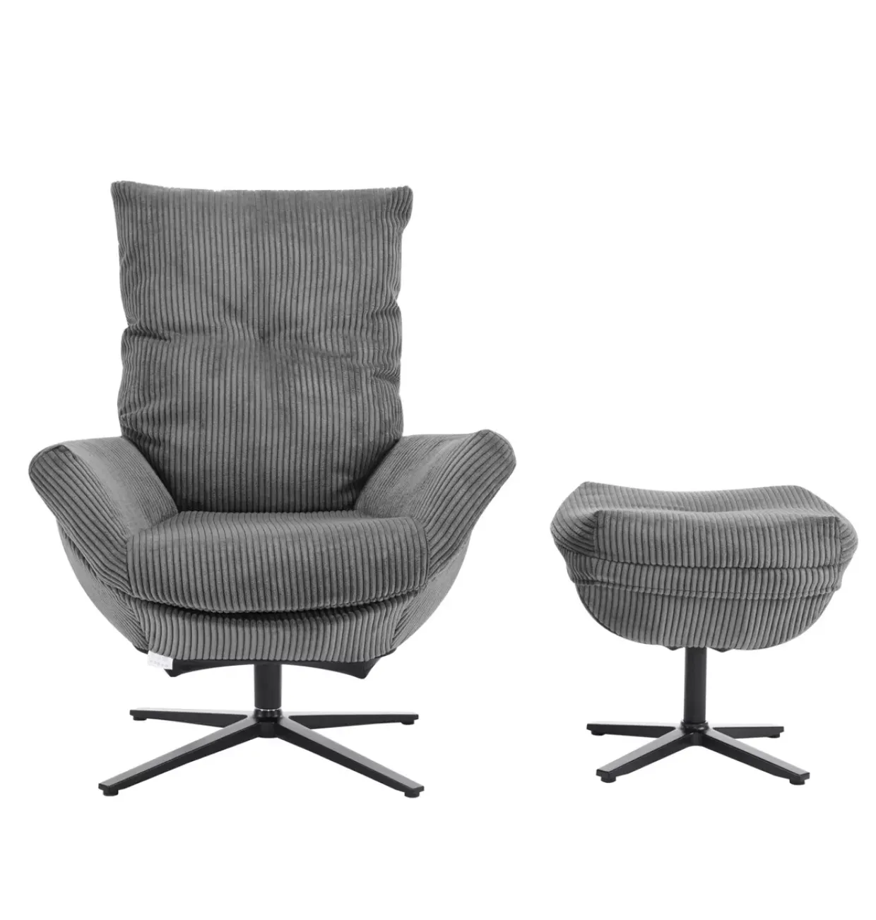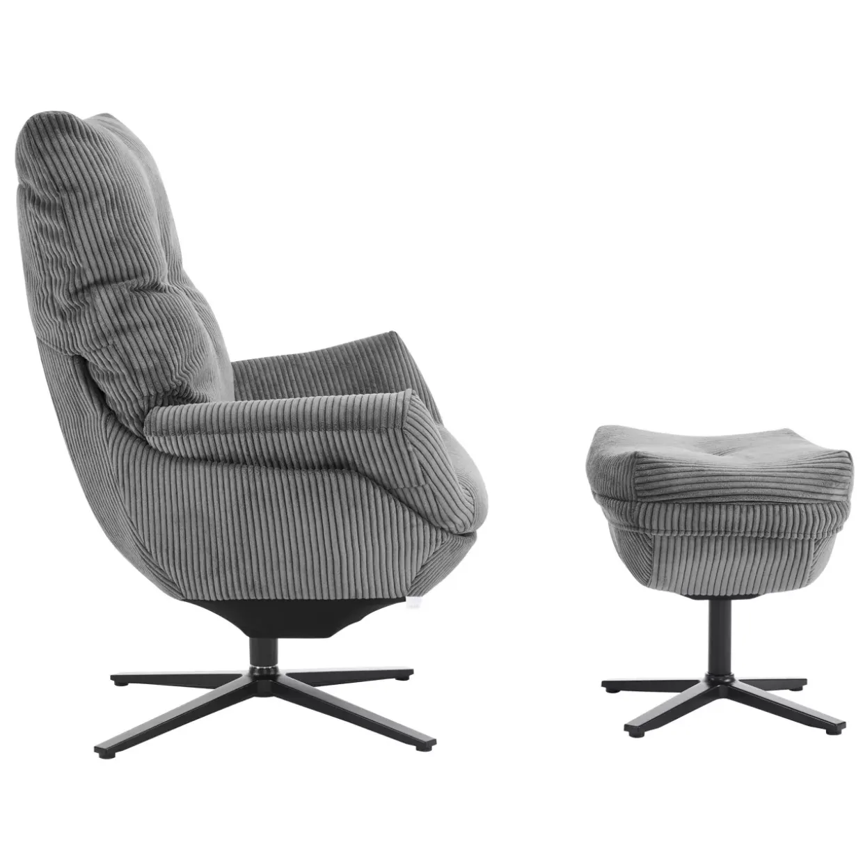 Graziöse Eleganz trifft auf funktionale Raffinesse – der Dormettingen Relaxsessel verbindet beides mit seinem konventionellen Stil. In einem harmonischen Mix aus grauem und schwarzem Matt fügt er sich nahtlos in jedes Interieur ein. Der Bezug aus Cord verleiht dem Sessel eine angenehme und zugleich robuste Oberfläche. Polyester als Textilart sorgt für Langlebigkeit und pflegeleichte Handhabung. Metallkomponenten mit einer matten, pulverbeschichteten Oberfläche bieten Stabilität und einen modernen Touch. Dank der 360°-Schwenkfunktion genießen Sie maximale Flexibilität und Bewegungsfreiheit, während die Schaumstofffüllung für optimalen Sitzkomfort sorgt. Der Rückenbezug aus Echtbezug unterstreicht den hochwertigen Charakter des Sessels, der sowohl optisch als auch haptisch überzeugt.Ein durchdachtes Design trifft auf erstklassige Materialien und verspricht eine lange Lebensdauer. Die Kombination aus Textil und Metall verleiht dem Sessel nicht nur eine ansprechende Optik, sondern auch eine stabile Grundlage. Perfekt für entspannte Stunden, bietet dieser Relaxsessel eine Oase der Erholung in Ihrem Zuhause.Erleben Sie den einzigartigen Komfort und die stilvolle Präsenz des Dormettingen Relaxsessels und lassen Sie sich von seiner Vielseitigkeit begeistern.