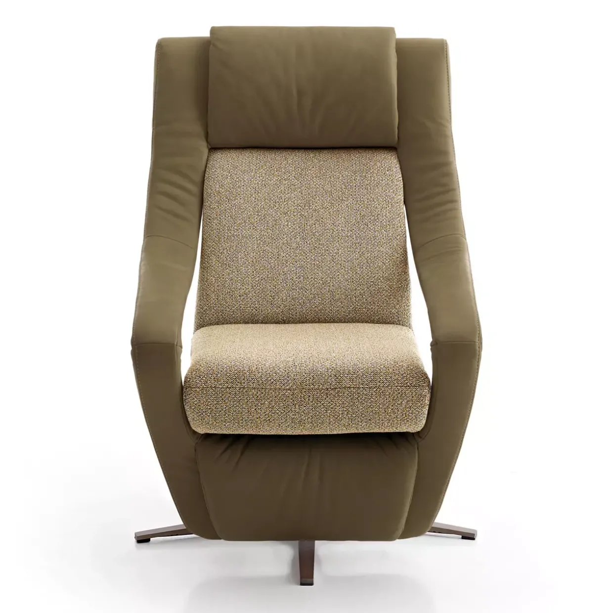 Ein weiteres bemerkenswertes Merkmal dieses Sessels ist die Materialkombination aus Metall und Leder, die sowohl Langlebigkeit als auch Eleganz bietet. Die Polyschaum-Polsterung gewährleistet ein angenehmes Sitzerlebnis, das durch die drehbare Kreuzfußkonstruktion flexibel ergänzt wird.