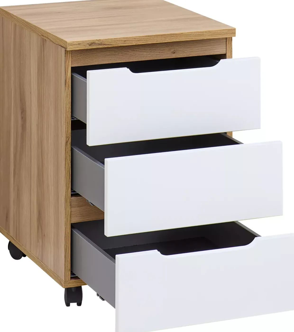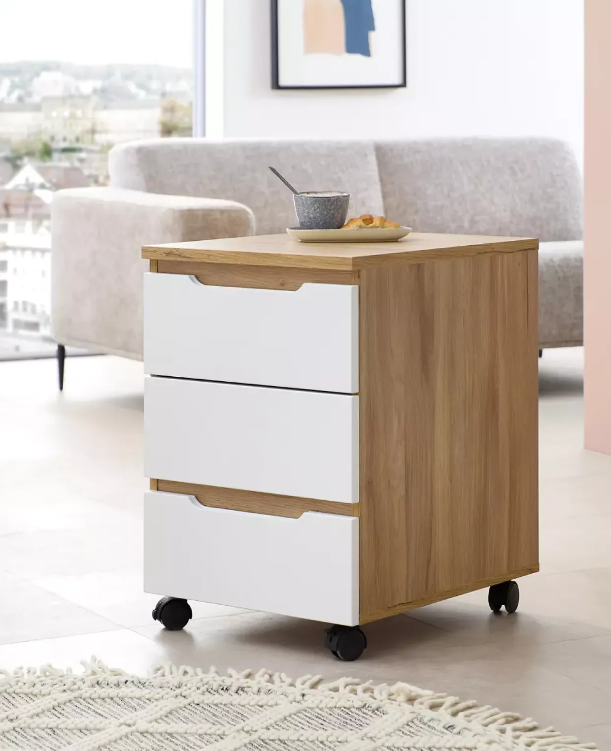Gefertigt aus hochwertigem Holzwerkstoff, präsentiert sich der Container in einer harmonischen Farbkombination aus Weiß, Braun und Eiche. Die matte Oberfläche verleiht dem Möbelstück eine zeitlose Ästhetik, die sich mühelos in verschiedene Raumkonzepte einfügt. Zwei der stabilen Rollen sind mit Bremsen ausgestattet, während die anderen beiden freilaufend sind, was Flexibilität und Sicherheit bei der Platzierung gewährleistet.
