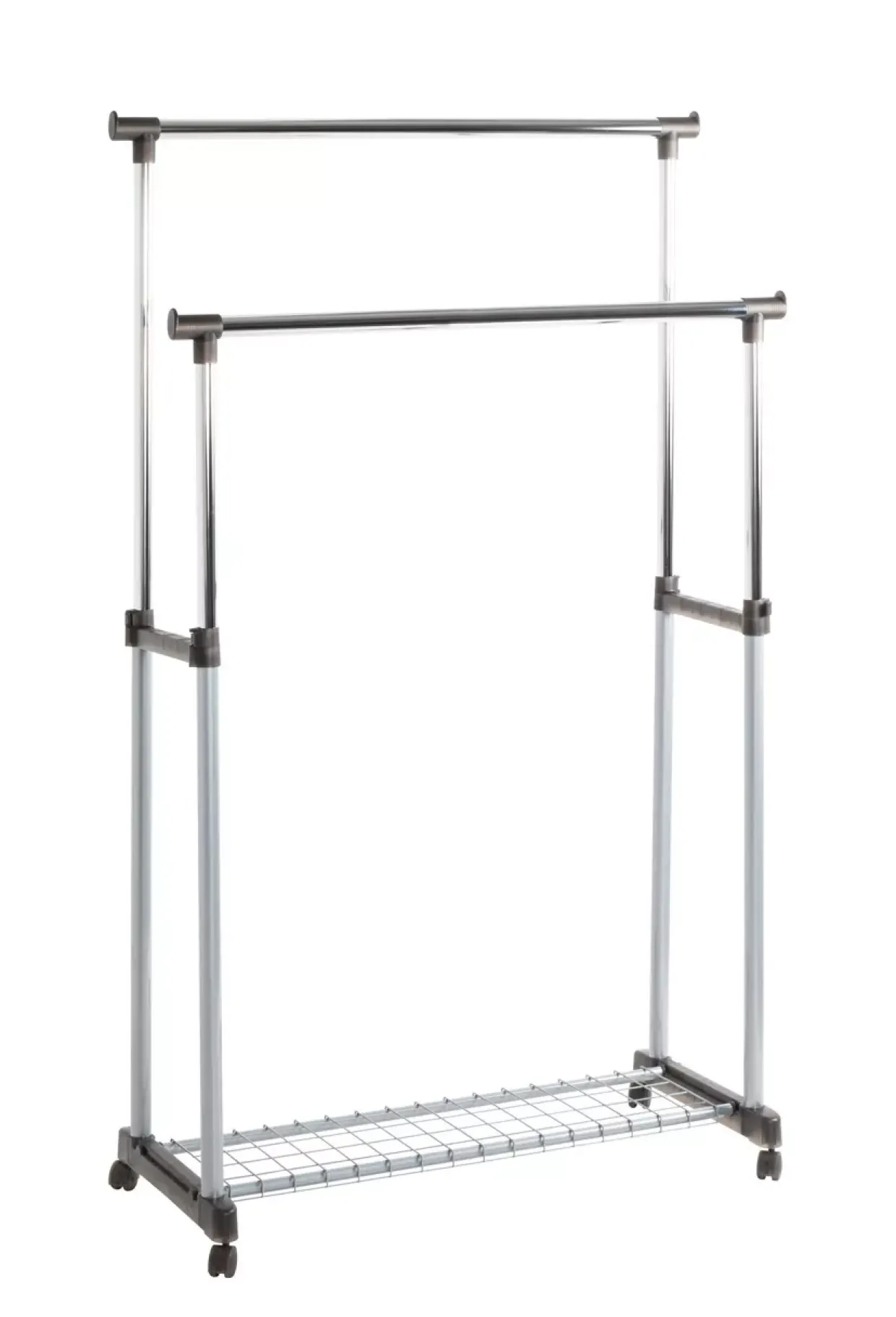 Mit zwei Einheiten bietet diese praktische Lösung genügend Platz für Ihre Garderobe und mehr. Die robuste Konstruktion aus Kunststoff und Metall sorgt für eine langlebige Nutzung. Zudem ermöglichen die Rollen eine flexible Positionierung, sodass Sie die Garderobe mühelos an jede gewünschte Stelle verschieben können.