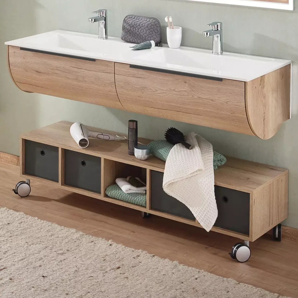 Der moderne Stil des Palino Rollwagens verleiht jedem Raum eine elegante und zeitgemäße Note. Aus hochwertigem Holzwerkstoff gefertigt, überzeugt dieses Möbelstück nicht nur durch seine Funktionalität, sondern auch durch seine ansprechende Optik in Halifax Eiche Nachbildung. Die robuste Bauweise sorgt dafür, dass der Rollwagen langlebig und stabil ist. Mit einer durchdachten Fußform auf Rollen lässt sich der Wagen mühelos in Ihrem Wohn- oder Arbeitsbereich bewegen. Dies macht ihn zu einem flexiblen Begleiter in Ihrem Alltag. Die Fächerbreiten von 26 cm bieten Ihnen ausreichend Platz, um verschiedene Gegenstände organisiert und griffbereit zu halten. Ob Akten, Bücher oder Dekorationen – alles findet seinen Platz.Ein echter Alleskönner, der durch seine schlichte Eleganz und Funktionalität überzeugt. Die Kombination aus modernem Design und praktischen Eigenschaften macht diesen Rollwagen zu einem unverzichtbaren Element in Ihrem Zuhause. Auch in engen Räumen oder unter Schreibtischen findet er dank seiner kompakten Bauweise problemlos seinen Platz. Lassen Sie sich von der Vielseitigkeit und dem zeitlosen Design inspirieren und entdecken Sie, wie einfach es sein kann, Ordnung mit Stil zu verbinden. Der Palino Rollwagen ist nicht nur ein Möbelstück, sondern ein durchdachter Helfer für Ihren Alltag.
