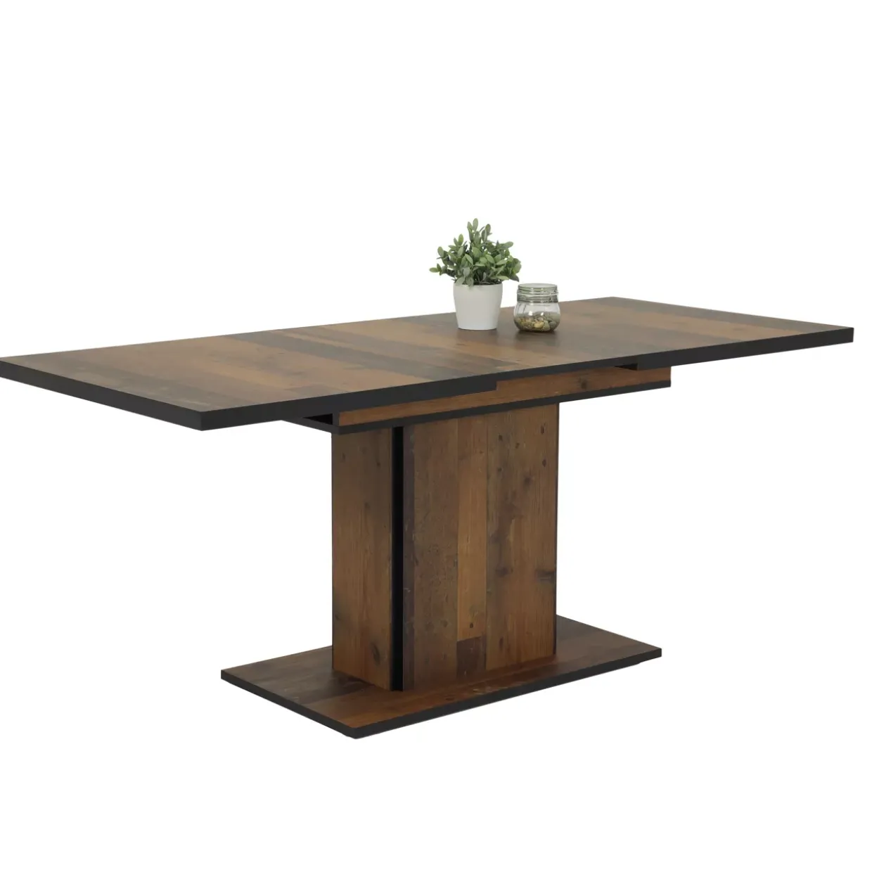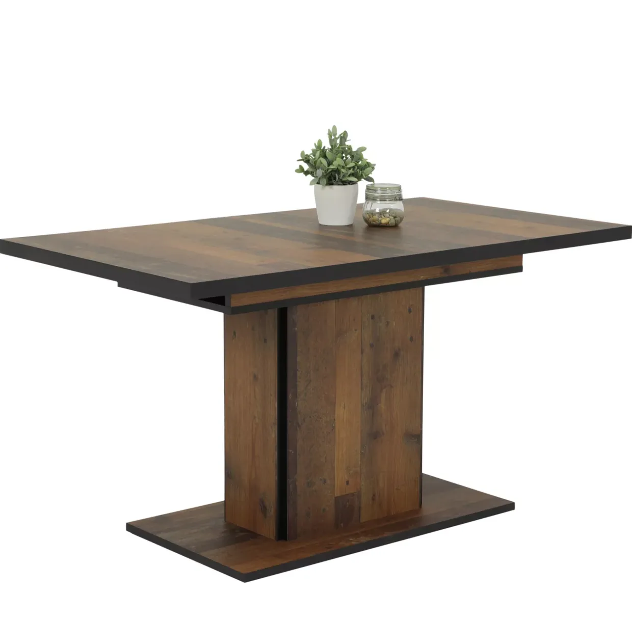 Säulentisch,Tischplatte ausziehbar mit Arretierung,Innenliegende Einlegeplatte,Alle Tischkanten farblich abgesetzt,Holzwerkstoff