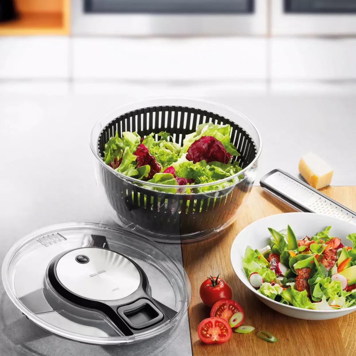 Das Material aus Kunststoff und Edelstahl sorgt für Langlebigkeit und eine einfache Reinigung. Dank der spülmaschinengeeigneten Bestandteile – Schüssel, Sieb und Antriebsscheibe – bleibt die Reinigung mühelos. Diese Salatschleuder ist ein zuverlässiger Begleiter durch das ganze Jahr, der sowohl Funktionalität als auch moderne Ästhetik in Ihre Küche bringt. Ideal für jene, die Wert auf Qualität und Design legen, ohne Kompromisse bei der Leistung einzugehen.