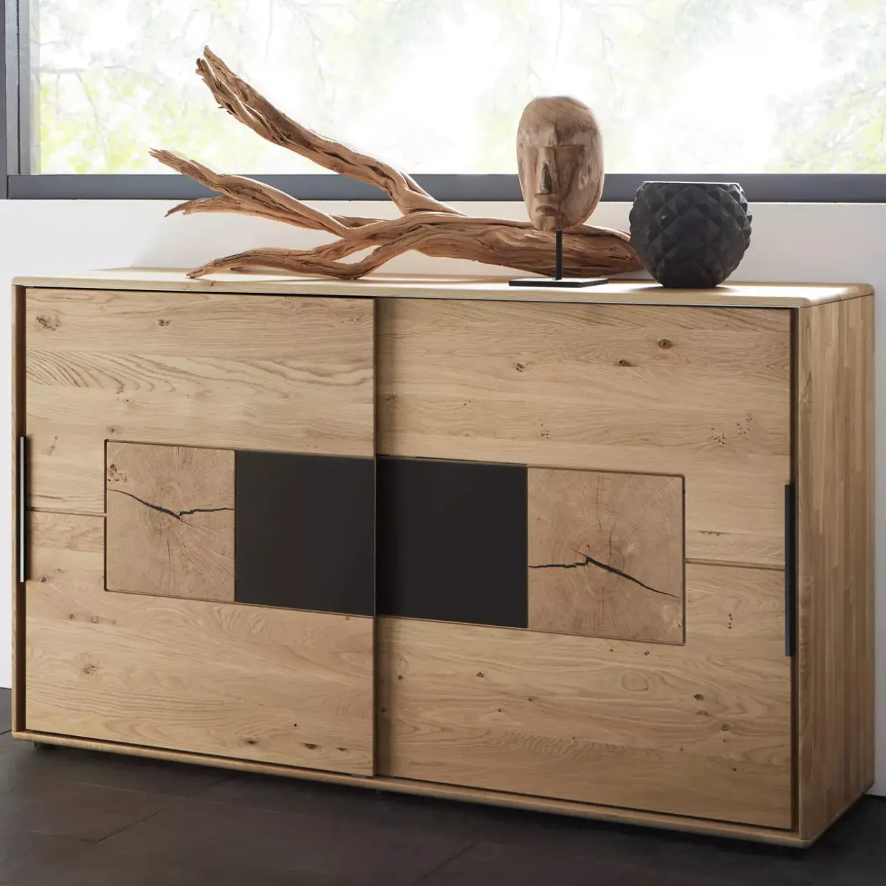 Kreativität trifft auf Funktionalität: Die Schiebetüren-Kommode vereint modernes Design mit praktischen Eigenschaften. Vielseitigkeit ist ein weiteres Merkmal, das durch die geschickte Kombination von Materialien und Farben erreicht wird. Der natürliche Charme der Wildeiche harmoniert perfekt mit den klaren Linien und dem zeitgemäßen Design.