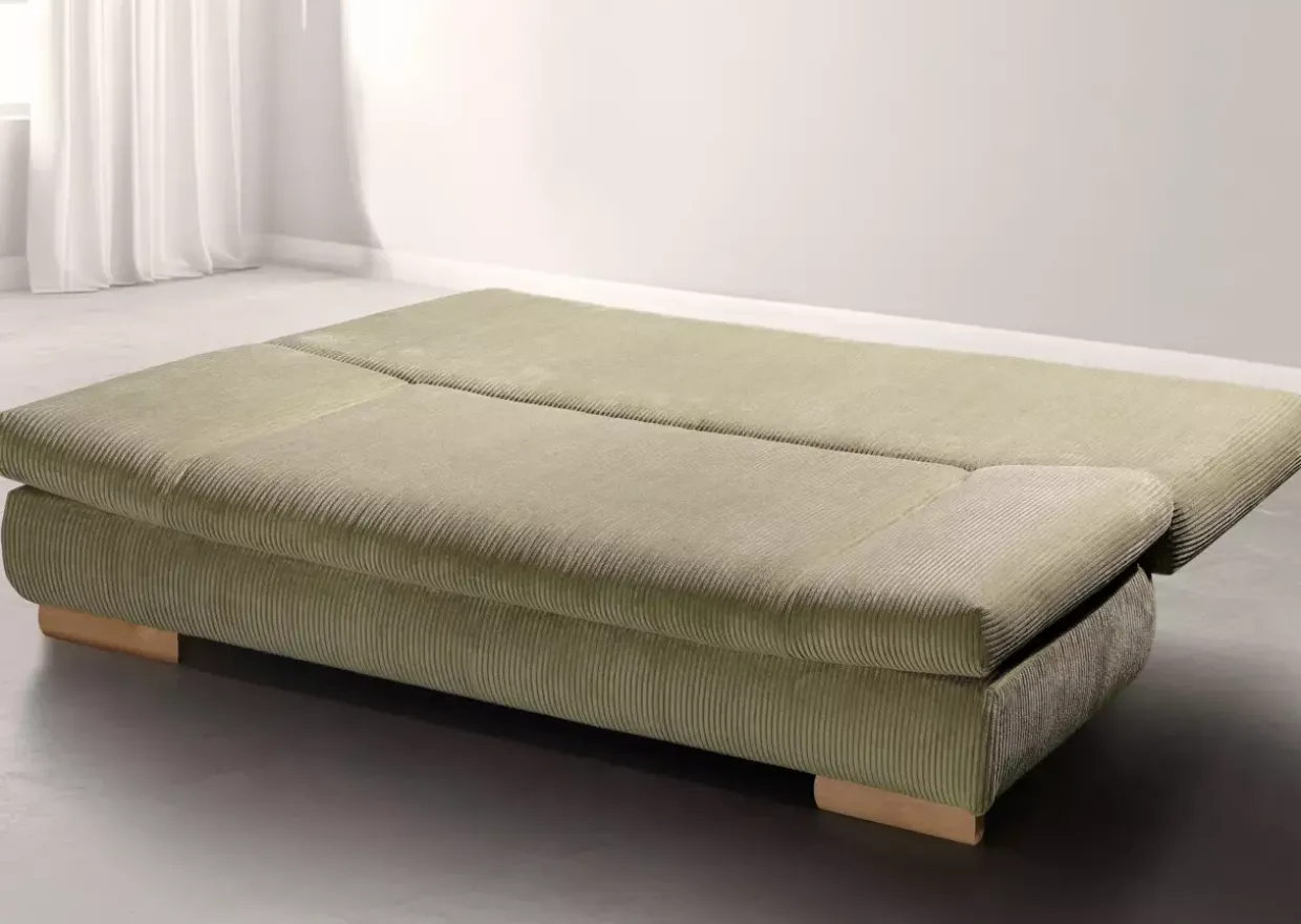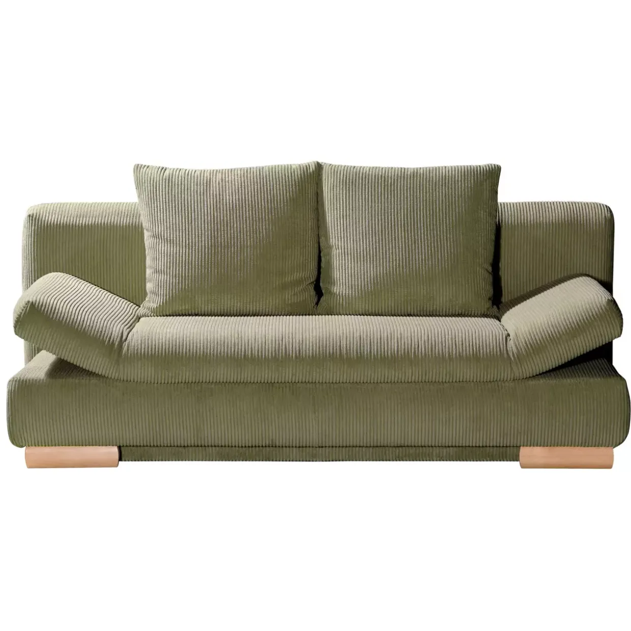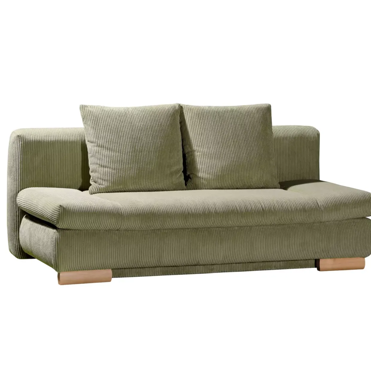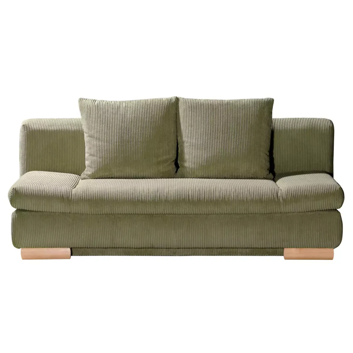 Olivfarbener Cordstoff trifft auf die natürliche Schönheit von Buche Holz und vereint sich zu einem modernen Schlafsofa, das stilvolle Eleganz in Ihr Wohnzimmer bringt. Die klaren Linien und die einfarbige Stoffausführung unterstreichen den zeitgenössischen Stil, der perfekt für anspruchsvolle Designliebhaber ist. Mit einem Federkern, eingebettet in Polyschaum und Wattevlies, bietet das Sofa hohen Sitzkomfort und lädt zum Entspannen ein.