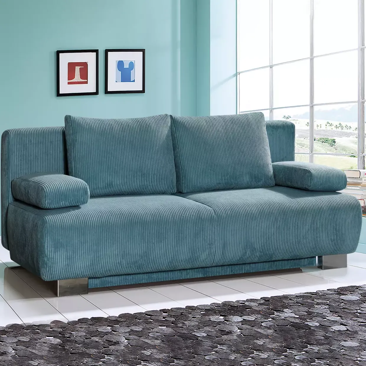 Ein stilvolles Leben in modernem Design: Das Rowan Schlafsofa in Cord türkis verleiht jedem Raum eine erfrischende Note. Die Gewebeart Cord kombiniert mit der Textilart Polyester sorgt für eine robuste und zugleich angenehme Haptik. Chromakzente im Metallrahmen verleihen dem Möbelstück einen eleganten Glanz.