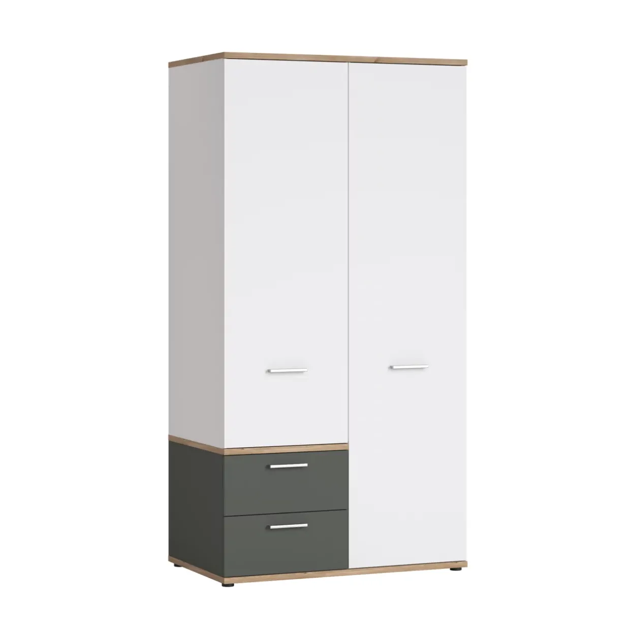 Mit Drehtüren ausgestattet, bietet dieser Schrank schnellen und bequemen Zugang zu Ihrem Kleidersortiment. Das Soft-Close-System sorgt für ein sanftes und geräuschloses Schließen der Türen, während die Vollauszüge der Schubkästen für maximale Übersichtlichkeit und leichten Zugriff auf den Inhalt sorgen.