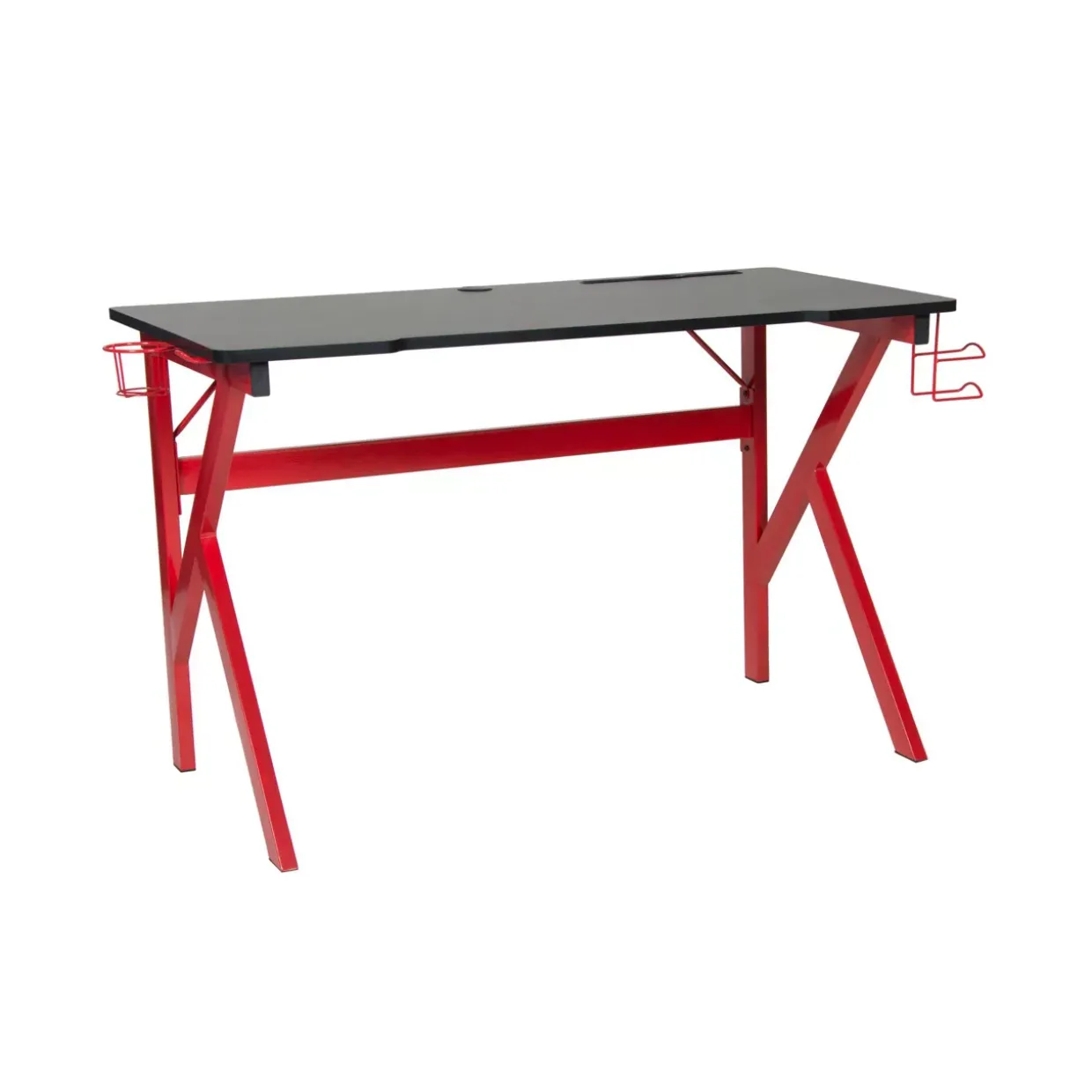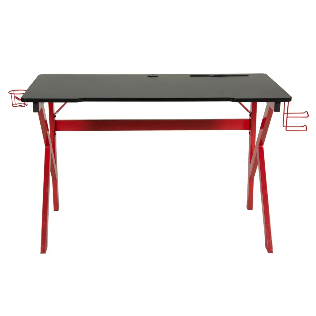 Der Schreibtisch „Game-Rocker“ ist ideal für passionierte Gamer und produktive Workaholics. Mit einer Größe von etwa 120x60x75 Zentimetern bietet er ausreichend Platz für Monitore, Tastaturen und weitere Arbeits- oder Gaming-Utensilien. Die schwarze Tischplatte aus robustem Spanplattenmaterial kombiniert mit einem stabilen roten Metallgestell sorgt nicht nur für eine ansprechende Optik, sondern auch für eine hohe Belastbarkeit von bis zu 80 kg. Zu den besonderen Highlights des Game-Rocker-Schreibtisches gehören praktische Features wie ein integrierter Becherhalter, ein Kopfhörerhalter und ein Kabeldurchlass. Diese Extras machen den Schreibtisch zu einem funktionalen und organisierten Arbeitsplatz, an dem alles seinen festen Platz hat. Der Becherhalter hält Getränke stets griffbereit, während der Kopfhörerhalter dafür sorgt, dass Kopfhörer sicher und ordentlich verstaut sind. Der Kabeldurchlass ermöglicht eine ordentliche Kabelführung und vermeidet Kabelsalat.