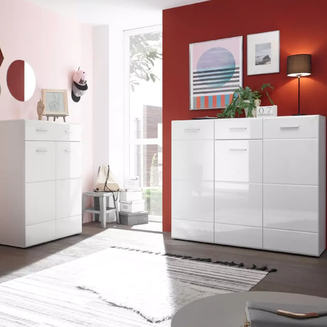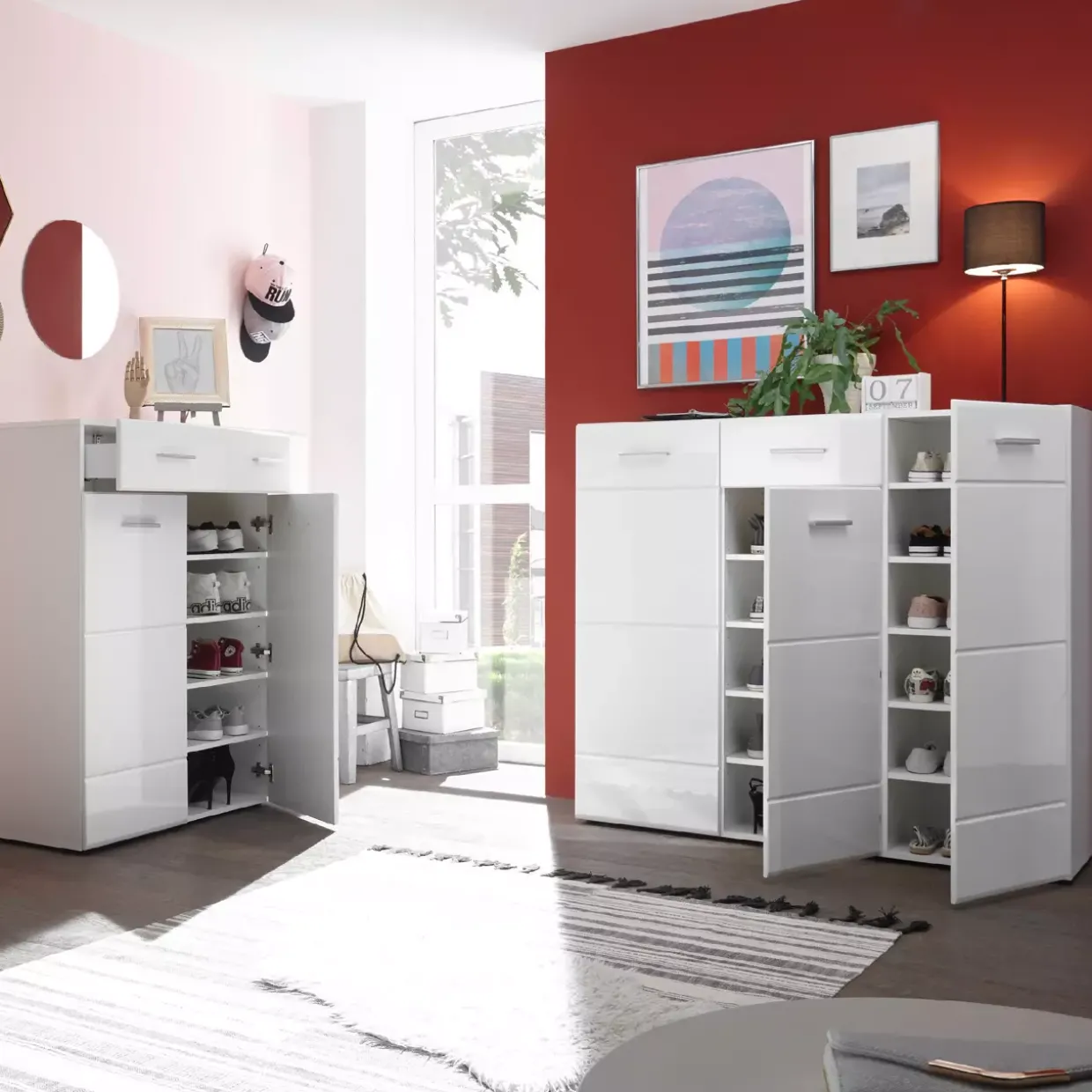 Eine Schuhkommode im modernen Stil zieht alle Blicke auf sich. Die Orlando 3 überzeugt mit ihrer klaren, zeitgemäßen Ästhetik und fügt sich nahtlos in jedes Wohnkonzept ein. Strahlend in Weiß und Weiß Hochglanz gestaltet, verleiht sie Ihrem Eingangsbereich eine frische und elegante Note.