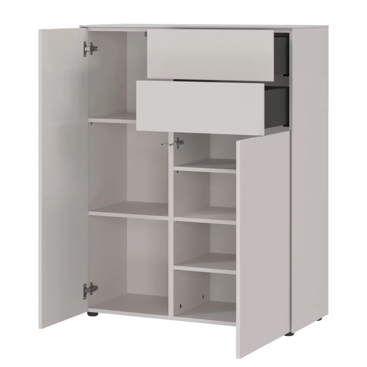 Gefertigt aus einem robusten Holzwerkstoff und melaminharzbeschichtet, ist der Schrank sowohl stoß- als auch schlagfest. Der umweltfreundliche Verzicht auf Styroporverpackungen unterstreicht die Nachhaltigkeit des Produkts. Hergestellt in Deutschland, steht er für höchste Qualität und Langlebigkeit. Pflegeleicht in der Handhabung, genügt es, die Oberflächen trocken zu wischen, um den edlen Look zu bewahren.