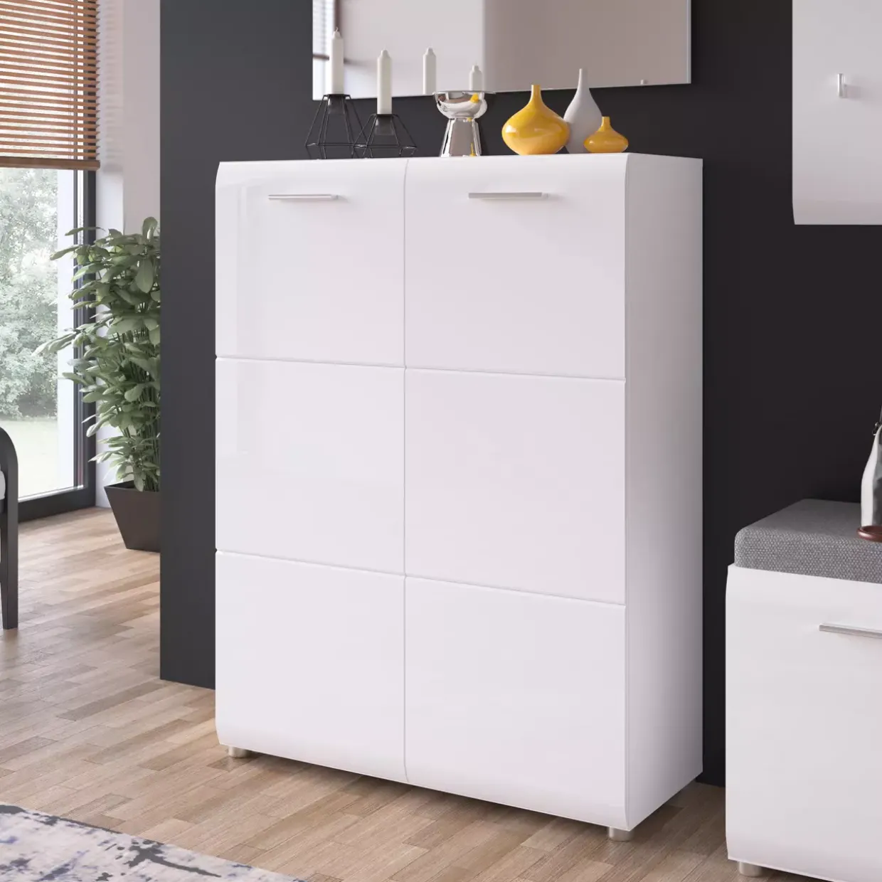 Alpinweiß, ein Symbol für zeitlose Eleganz, bildet die Grundlage dieses modernen Schuhschranks. Der MERANO Schuhschrank bringt durch sein Design einen Hauch von Raffinesse in Ihren Eingangsbereich. Mit einer Kombination aus Alpinweiß und PVC in Hochglanzweiß, bietet er eine stilvolle Lösung zur Organisation Ihrer Schuhe. Die Drehtüren verleihen dem Möbelstück eine klassische Note, während sie gleichzeitig den Zugang zu Ihrem Schuhwerk erleichtern. Hergestellt aus hochwertigem Holzwerkstoff, verspricht der Schrank Langlebigkeit und Stabilität. Der moderne Stil passt sich mühelos verschiedenen Einrichtungsstilen an und schafft eine harmonische Atmosphäre.Ein Schuhschrank ist mehr als nur eine Aufbewahrungsmöglichkeit. Er trägt dazu bei, Ordnung zu schaffen und den Raum optisch aufzuwerten. Die Wahl eines modernen Designs in Kombination mit funktionalen Elementen wie Drehtüren macht diesen Schuhschrank zu einer praktischen und ästhetischen Investition für Ihr Zuhause.Darüber hinaus ist die Pflege des Schranks unaufwändig, was ihn besonders benutzerfreundlich macht. Ein sanfter Wisch mit einem feuchten Tuch genügt, um die Oberfläche in Hochglanz erstrahlen zu lassen. Der MERANO Schuhschrank verbindet Funktionalität und Stil auf harmonische Weise, wodurch er sich als idealer Begleiter für Ihren Eingangsbereich erweist.