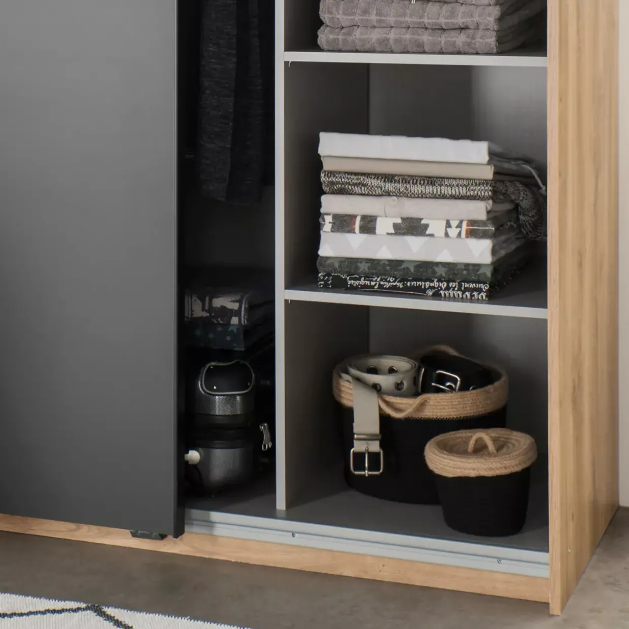 Mit einem modernen Stil beeindruckt der Cardiff Schwebetürenschrank in jedem Raum. Die zeitgemäße Kombination aus Plankeneiche-Nachbildung und graphitfarbenen Akzenten verleiht diesem Schrank eine elegante Note. Raffiniert gestaltet, bietet die Schwebetür nicht nur eine platzsparende Lösung, sondern setzt auch stilvolle Akzente.