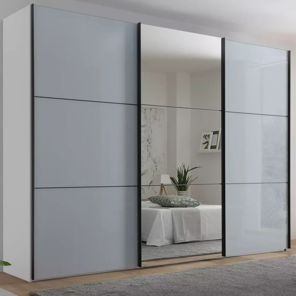 Farbton: Korpus Weiß Nachbildung / Front Hellgrauglas / Front Spiegel / Griffe Schwarz matt