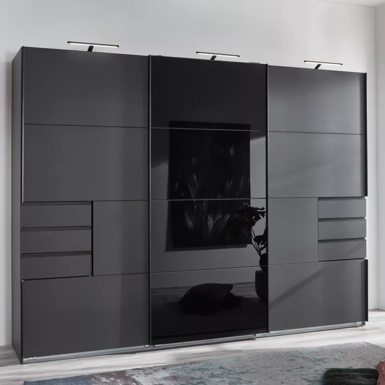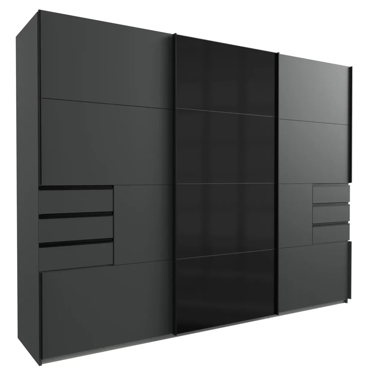 Graphit Dekor vereint mit elegantem schwarzem Glas – der Schwebetürenschrank Saigon setzt auf eine moderne Ästhetik. Diese Kombination aus Glas und Holzwerkstoff schafft nicht nur ein optisches Highlight, sondern bietet auch eine solide und langlebige Konstruktion.