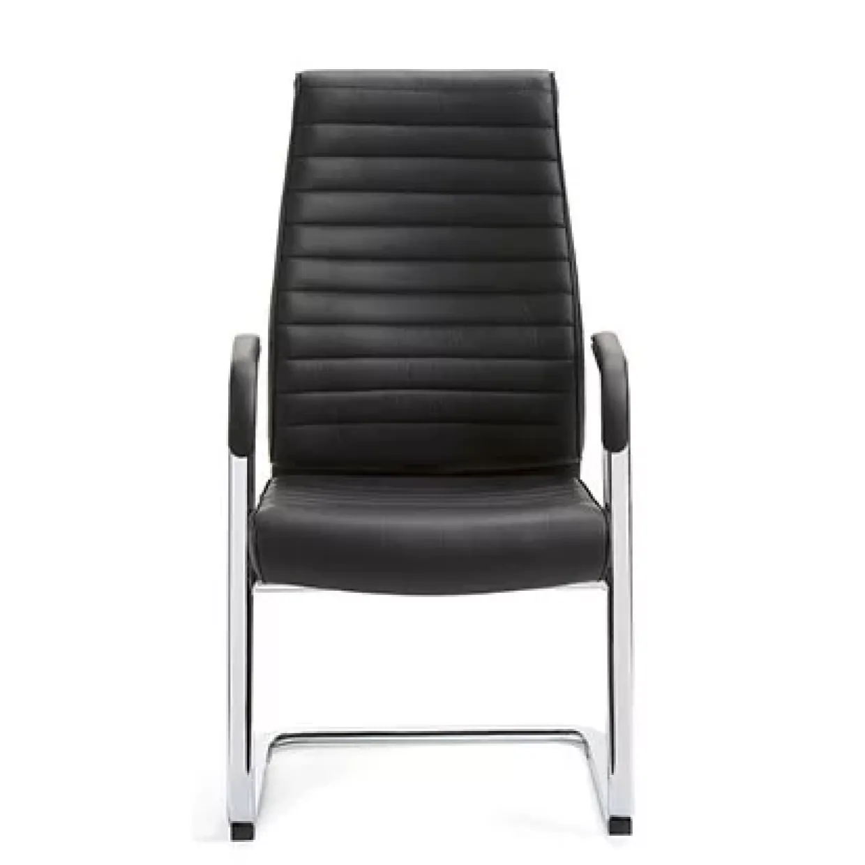 Gestell Chrom, mittlerer Rücken, Vorderseite Echtleder Schwarz, Steppnähte, feste Chrom-Armlehnen mit Echtleder-Polsterung, Sitzhöhe 44 cm.