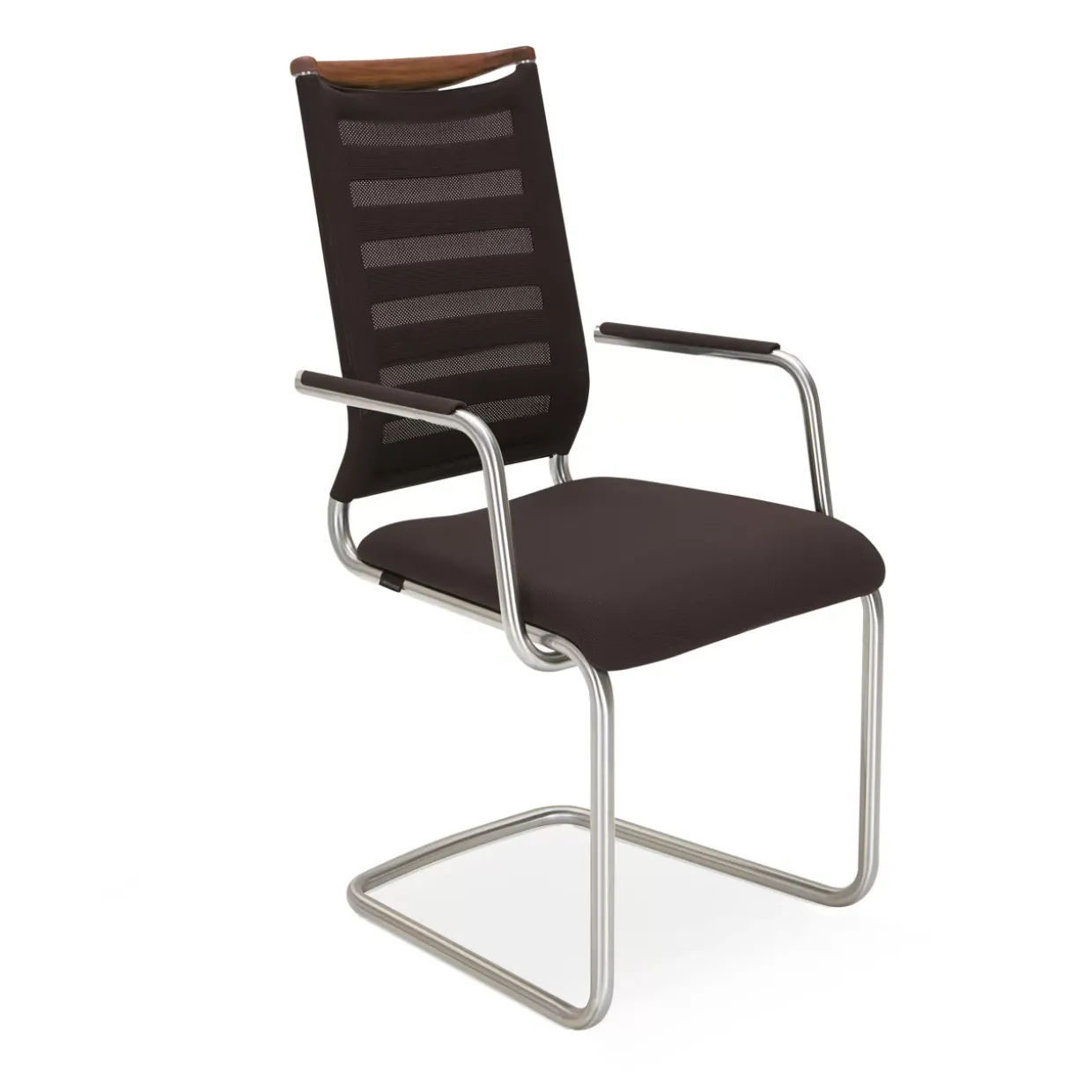 Ein geöltes Kopfstück in Colorado Nussbaum verleiht dem Freischwinger Lilli eine elegante Note und verbindet modernes Design mit klassischer Schönheit. Die Kombination aus Holz, Stoff und Metall sorgt für eine harmonische Materialkomposition, die sowohl ästhetisch als auch funktional überzeugt. Ein Sperrholzsitz mit Schaumauflage bietet optimalen Sitzkomfort und lädt zum Verweilen ein.