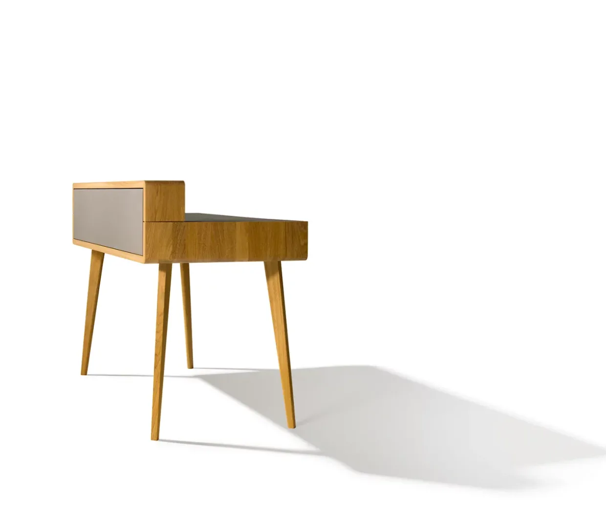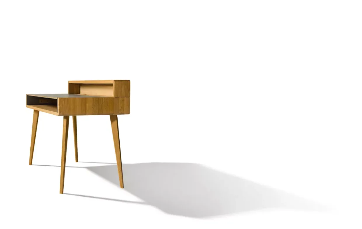 Eleganz trifft auf Funktionalität. Der Sekretär Sol vereint natürliche Materialien wie Holz und Leder zu einem stilvollen Möbelstück. Die warme Tartufo-Lederfarbe harmoniert perfekt mit der geölten Eiche, was dem Raum eine gemütliche Atmosphäre verleiht.
