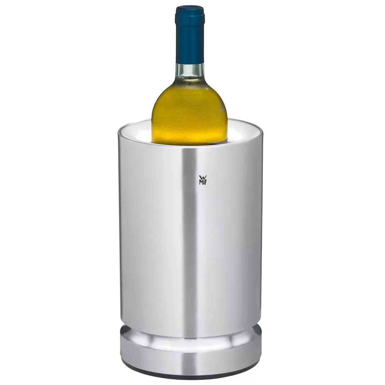 Dank der WMF Easy Touch Technologie lässt sich die Helligkeit der Beleuchtung durch einfaches Antippen des Gehäuses in drei Stufen regulieren. Dies ermöglicht es Ihnen, die Beleuchtung perfekt auf den jeweiligen Anlass abzustimmen. Mit einem Durchmesser von bis zu 9,2 cm finden Wein-, Sekt- und Champagnerflaschen problemlos Platz im Kühler.