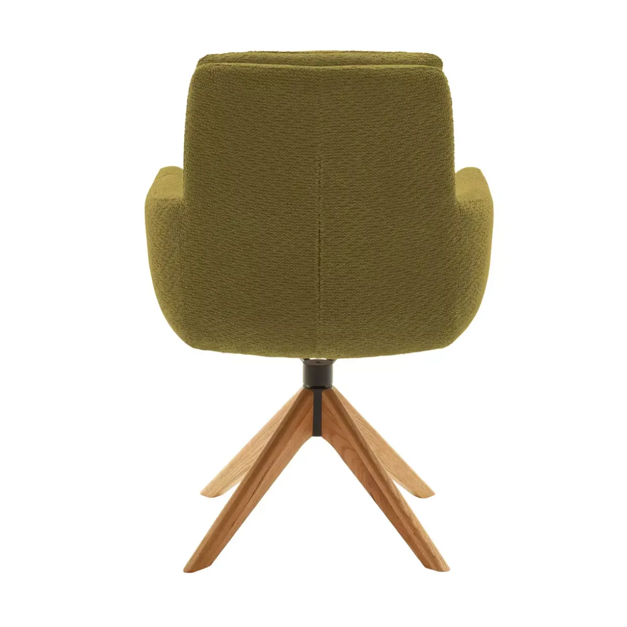 Ein Hauch von Luxus in Ihrem Wohnraum: Der Bolivar Sessel präsentiert sich in einer eleganten Kombination aus Strukturgewebe in Olive und massivem Eichenholz. Die sorgfältig ausgewählte Eiche verleiht nicht nur Stabilität, sondern auch eine natürliche Ästhetik, die durch die lackierte Oberfläche dezent zur Geltung kommt. Der Sessel bietet durch das 4-Fußgestell aus Eiche nicht nur sicheren Stand, sondern auch eine klassische Eleganz, die in jedem Raum eine gute Figur macht. Der Luxus Komfortsitz, gepolstert mit einem hochwertigen Taschenfederkern, sorgt für ein unvergleichliches Sitzvergnügen. Besonders hervorzuheben ist die Funktionalität dieses Sessels. Er lässt sich um 360 Grad drehen und passt sich dank der Nivellierung perfekt an unebene Bodenverhältnisse an. Die integrierte Schwingfunktion bringt zusätzlichen Komfort und lädt zum entspannten Verweilen ein.Das verwendete Polyestergewebe überzeugt durch seine Strapazierfähigkeit und Langlebigkeit, während die Farbkombination aus Olive und Eiche eine zeitlose Eleganz ausstrahlt. Dieser Sessel ist nicht nur eine Sitzgelegenheit, sondern ein Ausdruck von Stil und Komfort, der sich harmonisch in Ihr Zuhause einfügt. Ein echtes Schmuckstück für Liebhaber konventionellen Designs.