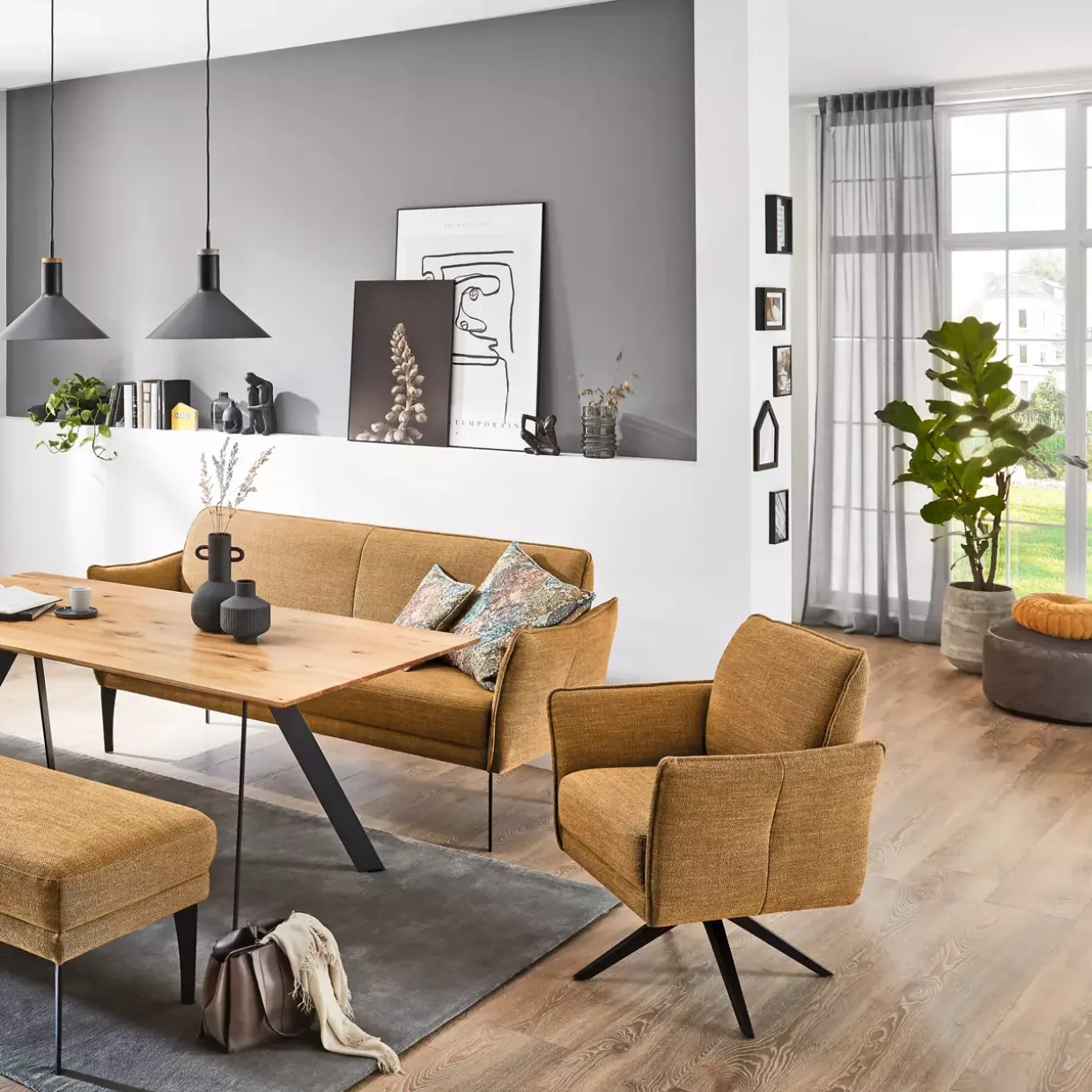 Der Piatto-Dining Sessel überzeugt durch seinen modernen Stil, der sich nahtlos in zeitgenössische Wohnräume einfügt. Eine harmonische Farbpalette in Curry und Schwarz struktur verleiht diesem Möbelstück eine besondere Eleganz und Vielseitigkeit. Die Kombination aus ansprechendem Design und hochwertigem Stoffmaterial sorgt für einen angenehmen Sitzkomfort.