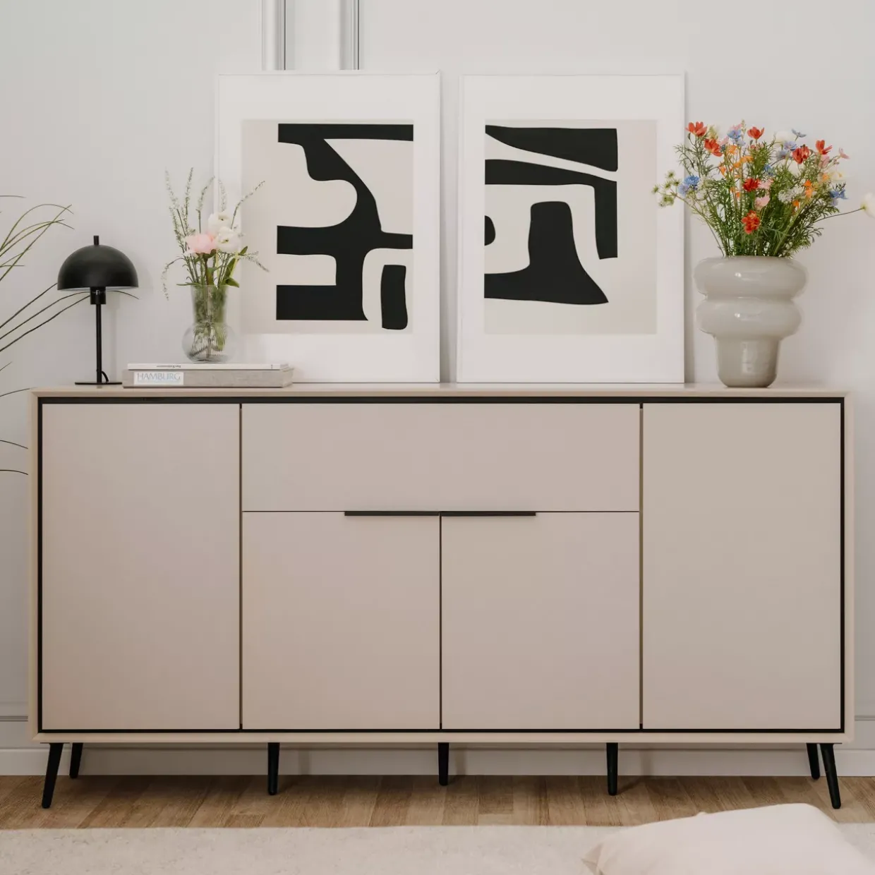 Die Falttür des Arona Sideboards besticht durch ihre moderne Eleganz und Funktionalität. In den Farben Sand und Schwarz gehalten, fügt sich das Möbelstück nahtlos in zeitgemäße Wohnräume ein und bietet eine harmonische Ergänzung zu verschiedensten Einrichtungsstilen.