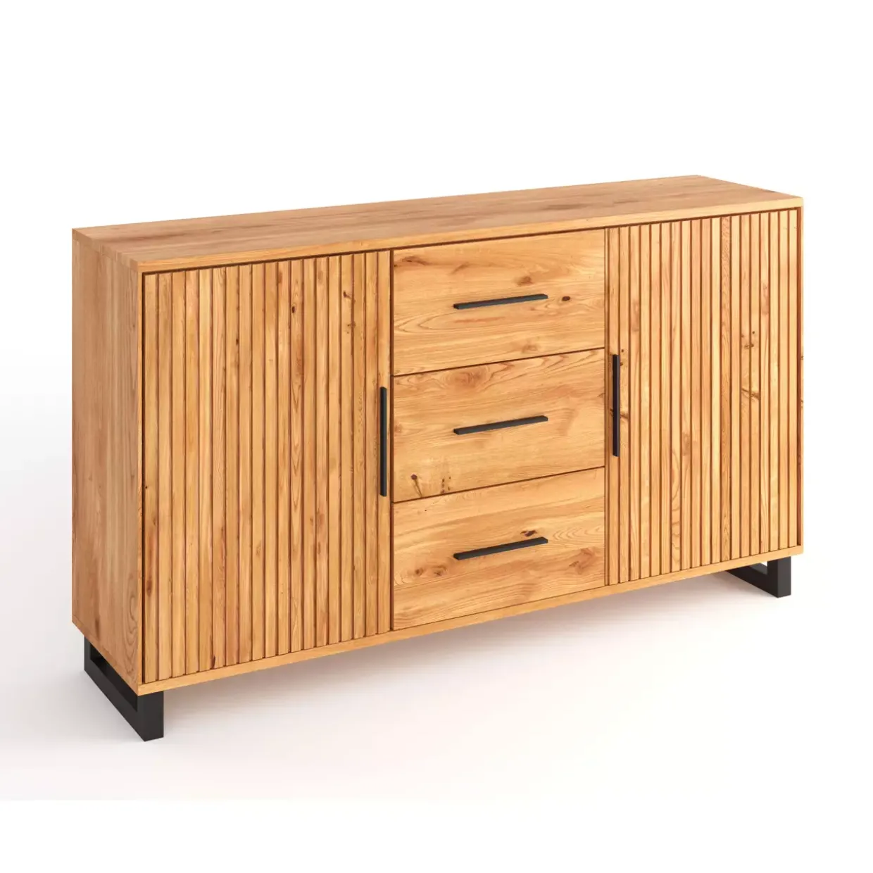 Eleganz trifft auf Funktionalität: Das Sideboard Martha beeindruckt mit einer furnierten Oberfläche, die sowohl ästhetisch ansprechend als auch langlebig ist. In einem modernen Loft-Stil gehalten, fügt es sich nahtlos in verschiedenste Einrichtungsstile ein. Die Kombination aus Eiche und Schwarz verleiht dem Möbelstück eine zeitlose Note, während die Akustikpaneele aus Eiche für eine angenehme Raumakustik sorgen.