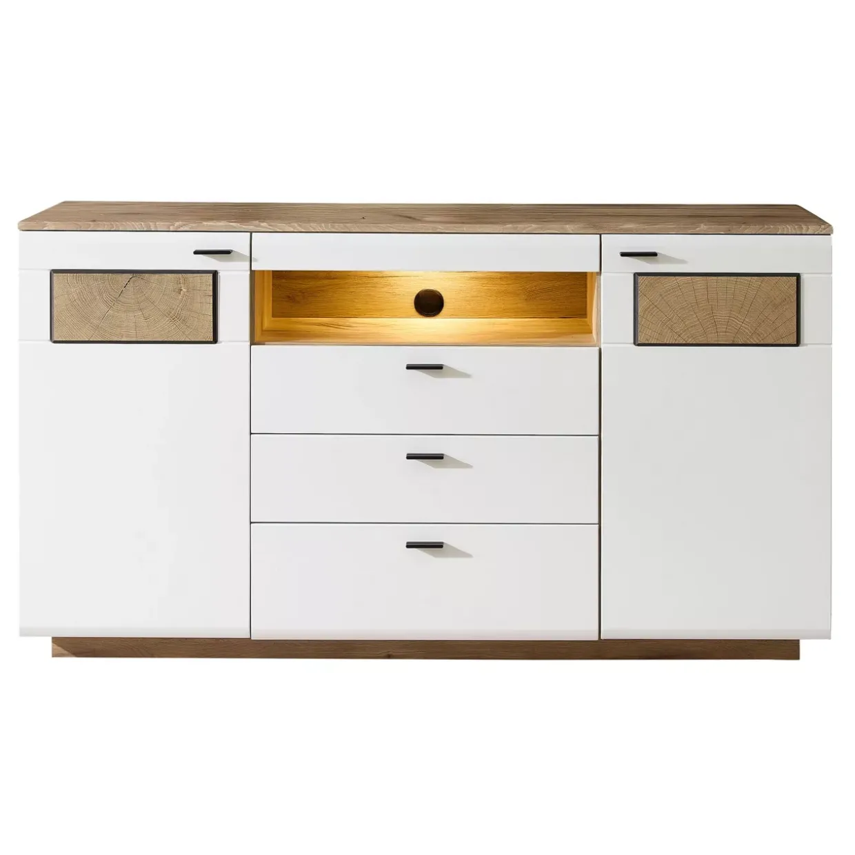 Die robuste Konstruktion aus einer Mischung von Holzwerkstoff, Kunststoff, Holz und Metall verspricht Langlebigkeit und Stabilität. Ein mattes Finish verleiht dem Möbelstück eine zeitlose Ästhetik, während der Sockel für einen festen Stand sorgt. Ein besonderes Highlight ist die optionale LED-Unterbaubeleuchtung, die auf Anfrage erhältlich ist und das Sideboard in ein sanftes Licht taucht.