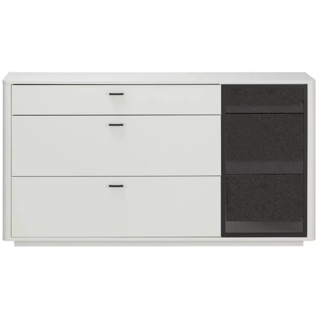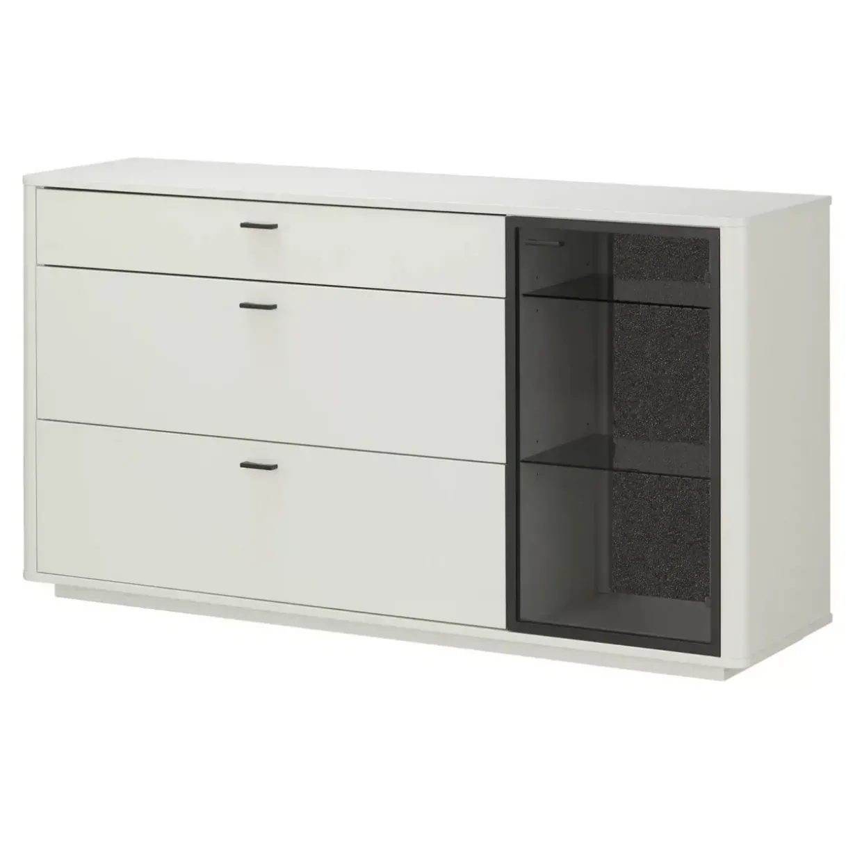 Mit einer eleganten Kombination aus Weiß lackiertem Holzwerkstoff und Kristallsteinabsetzungen verkörpert das Montreal Sideboard zeitlose Eleganz. Diese harmonische Mischung aus Glas, Holzwerkstoff und Metall verleiht dem Möbelstück eine robuste und zugleich stilvolle Erscheinung. Der großzügige Stauraum wird durch drei praktische Schubkästen ergänzt, die für Ordnung und Übersicht sorgen. Eine Glastür bietet nicht nur Zugang zum Inneren des Sideboards, sondern verleiht auch einen Hauch von Transparenz und Leichtigkeit. Im Inneren finden Sie zwei Glaseinlegeböden, die sich ideal zur Präsentation dekorativer Gegenstände eignen und einen Hauch von Raffinesse in Ihr Zuhause bringen.Das Montreal Sideboard fügt sich nahtlos in konventionelle Wohnräume ein und bietet eine perfekte Balance zwischen Funktionalität und Ästhetik. Es wurde sorgfältig entworfen, um sowohl praktische Anforderungen als auch gestalterische Ansprüche zu erfüllen. Die hochwertigen Materialien und die durchdachte Bauweise machen es zu einem langlebigen Begleiter im Alltag. Wenn Sie auf der Suche nach einem Möbelstück sind, das Stil und Funktion vereint, könnte dieses Sideboard mit seinen vielseitigen Eigenschaften genau das Richtige für Sie sein. Genießen Sie die perfekte Symbiose aus Design und Nutzen in Ihrem Zuhause.