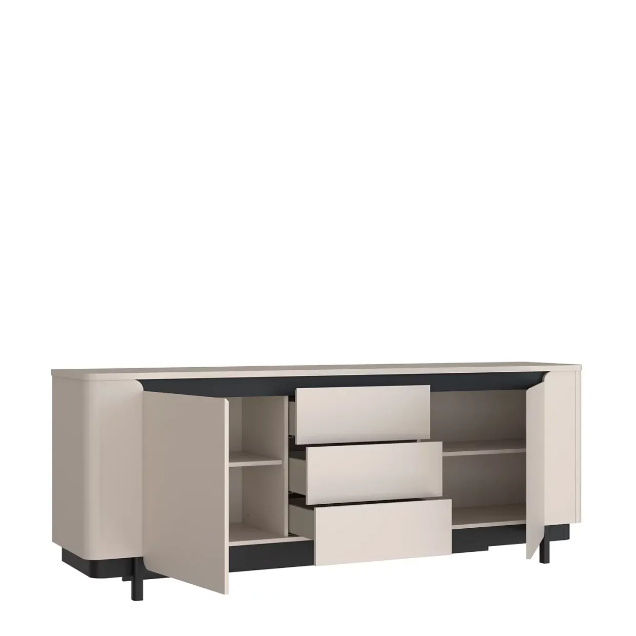 Ein Hauch von Modernität trifft auf zeitlose Eleganz – das Vodol Sideboard vereint beides meisterhaft. Die stilvolle Kombination aus sandfarbenen und schwarzen Elementen sorgt für ein harmonisches Gesamtbild, das sich nahtlos in jedes moderne Wohnkonzept einfügt.