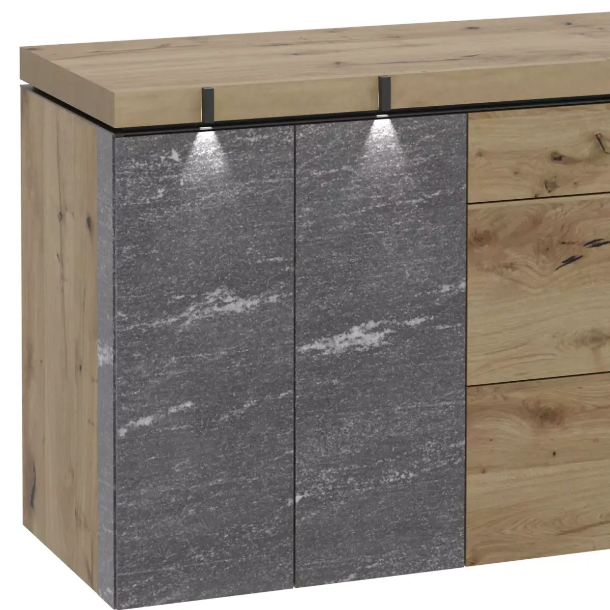 Ein Hauch von Modernität trifft auf rustikale Eleganz: Das Sideboard VrockLiving vereint die warmen Töne der Alteiche rustiko gebürstet mit der kühlen Raffinesse des Alpengranits in Schwarzgrau. Diese harmonische Kombination verleiht jedem Raum eine exklusive Note. Vier dieser stilvollen Meisterwerke stehen bereit, um Ihr Zuhause zu bereichern.