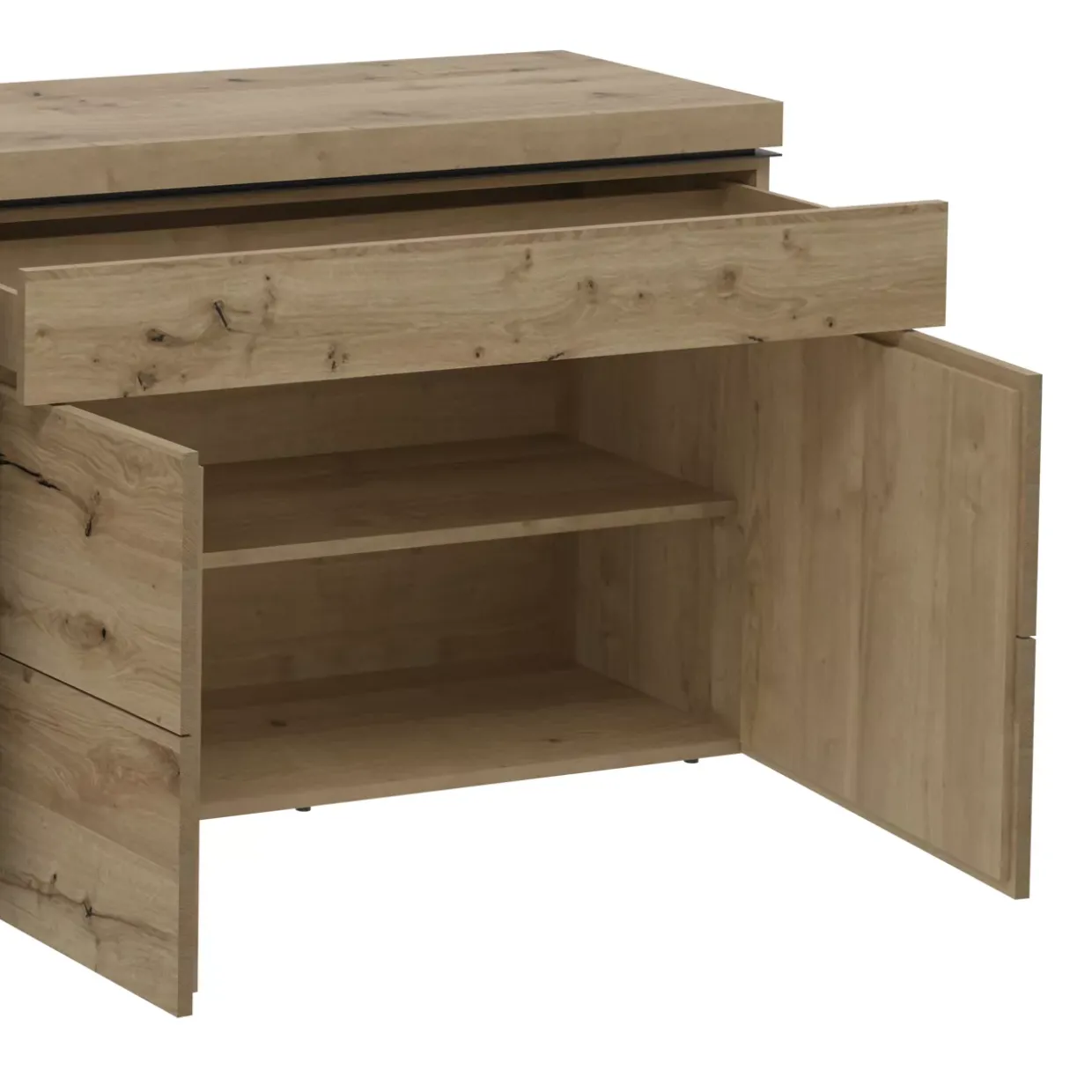 Die feine Holzoberfläche ist furniert und verleiht dem Möbelstück eine zeitlose Schönheit sowie eine angenehme Haptik. Die Push-To-Open-Funktion sorgt für ein sanftes und geräuschloses Öffnen und Schließen der Türen und Schubladen, was den Komfort im Alltag deutlich erhöht. Ein besonderes Highlight ist die Möglichkeit, passende Beleuchtung hinzuzufügen, welche auf Anfrage gegen Mehrpreis erhältlich ist. Dies unterstreicht die edle Präsentation Ihrer Lieblingsstücke und schafft eine stimmungsvolle Atmosphäre.