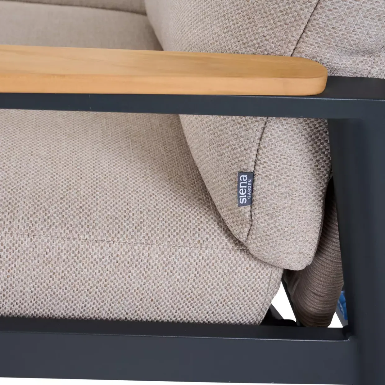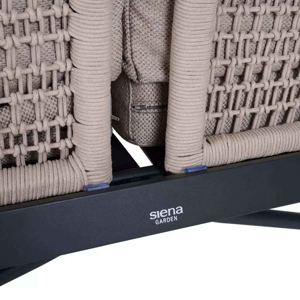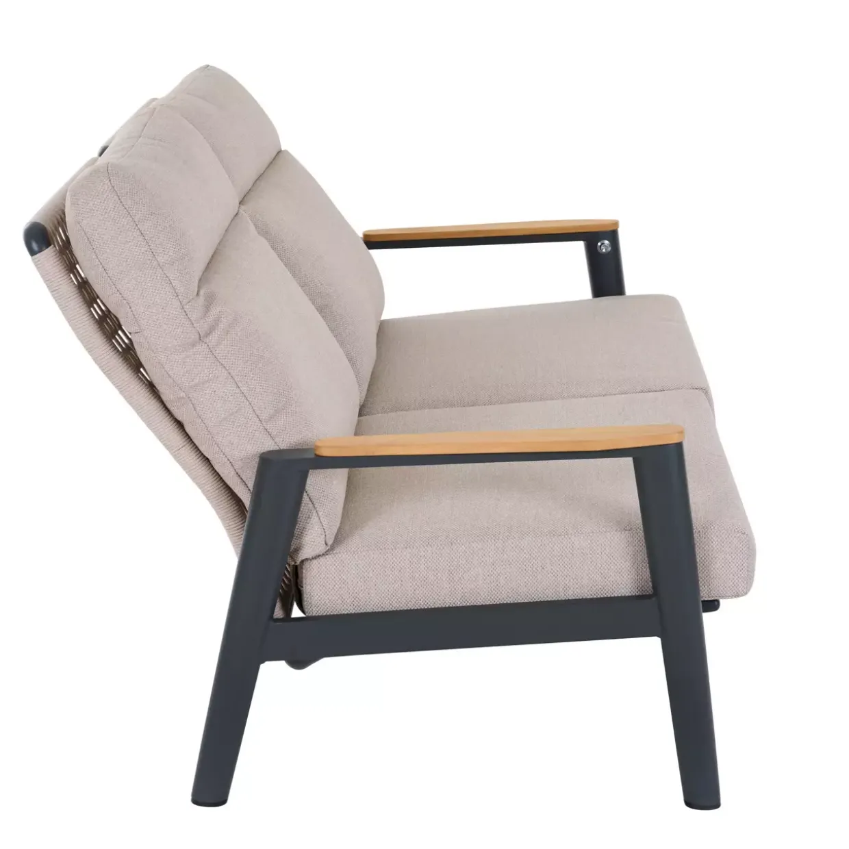 Die Materialkombination aus Stoff und Metall sorgt für Langlebigkeit und Stabilität, während das Design der Bank eine moderne und zeitlose Ausstrahlung besitzt. Diese Gartenbank ist ideal für alle, die Wert auf Qualität und stilvolle Gestaltung legen.