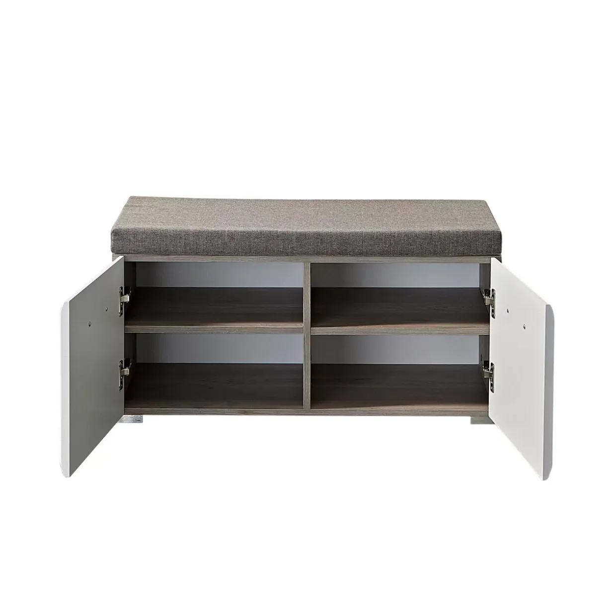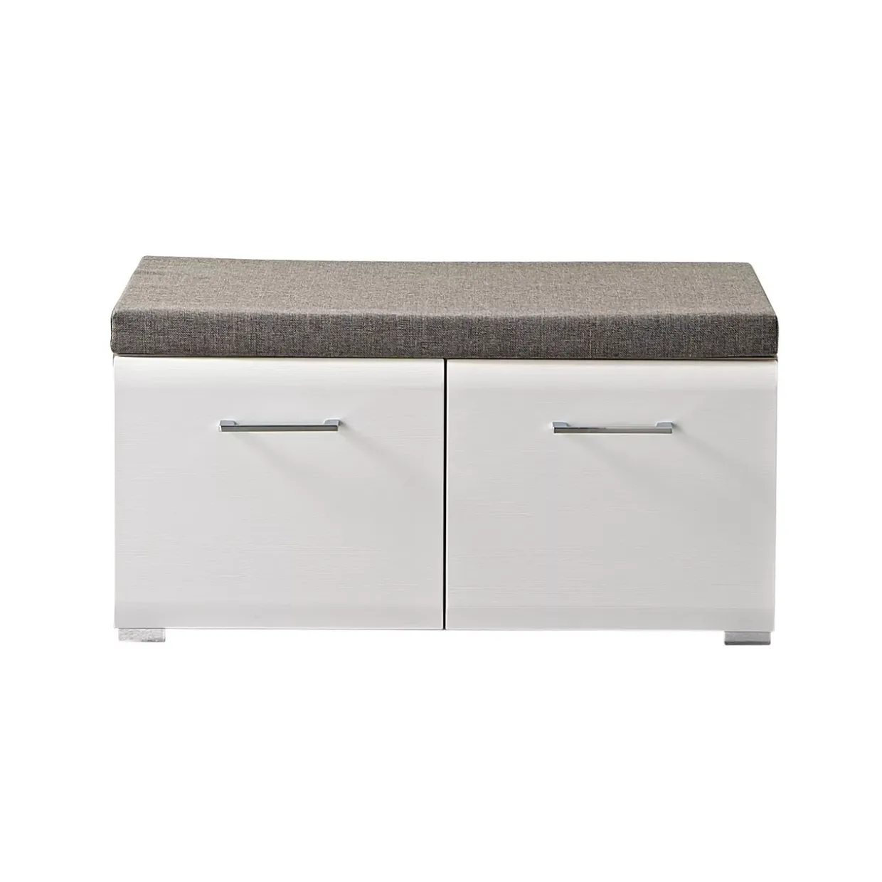 FUNNY Bank m. Sitzkissen Silbereiche/weiß MDF Str. B/H/T ca.84/37/40 cmEin Hauch von Modernität zieht mit dieser stilvollen Sitzbank in Ihr Zuhause ein. Die harmonische Farbgebung in Weiß, Silbereiche, Holz und Beige verleiht jedem Raum eine zeitlose Eleganz. Gefertigt aus robustem Holzwerkstoff und weichen Textilien, vereint dieses Möbelstück Langlebigkeit mit Komfort.Die Solobank punktet mit einem besonderen Extra: einem Soft-Close-System, das für ein sanftes und geräuschloses Schließen sorgt. Diese Funktion ist nicht nur praktisch, sondern schont auch das Material und verlängert die Lebensdauer der Bank. Der minimalistische Stil passt sich mühelos verschiedenen Einrichtungsstilen an und bietet gleichzeitig eine praktische Sitzgelegenheit.Pflegeleicht und unkompliziert lässt sich die Sitzbank durch einfaches Trockenwischen sauber halten. Dies gewährleistet eine stets einladende Optik ohne großen Aufwand. Ob im Flur, Wohnzimmer oder Schlafzimmer – die Bank fügt sich nahtlos in jeden Raum ein und schafft eine einladende Atmosphäre.Entdecken Sie die perfekte Kombination aus Funktionalität und ästhetischem Design, die diese Sitzbank zu einem unverzichtbaren Bestandteil Ihres Interieurs macht. Eine Investition in Qualität und Stil, die Sie lange begleiten wird.