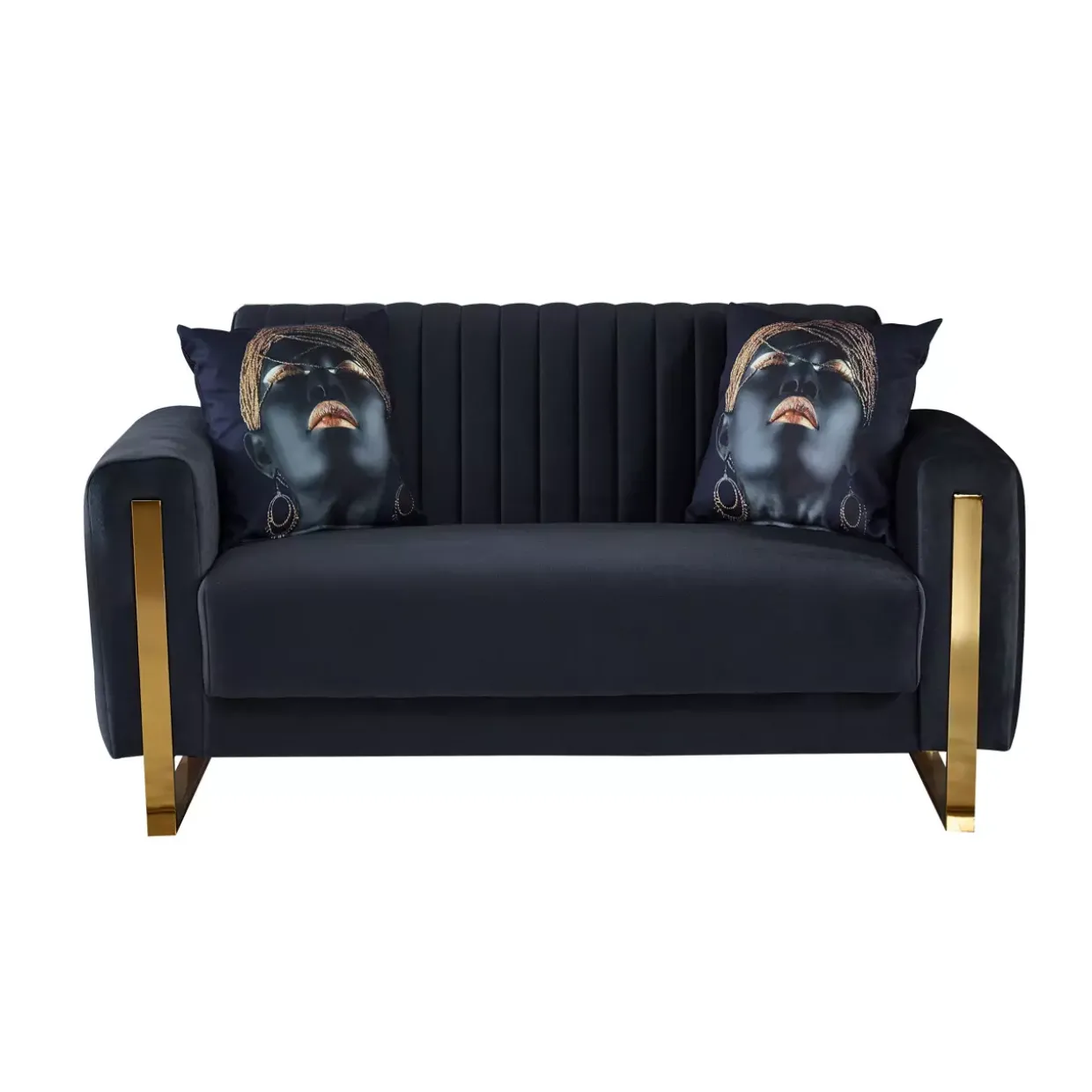 Ein Hauch von Glamour zieht mit dem Bogota 2-Sitzer in Ihr Zuhause ein. Softes Schwarz und goldfarbene Akzente vereinen sich zu einem eleganten Stil, der jeden Raum aufwertet. Die Kombination aus Stoff und Metall verleiht dem Möbelstück nicht nur eine ansprechende Optik, sondern auch Stabilität und Langlebigkeit.