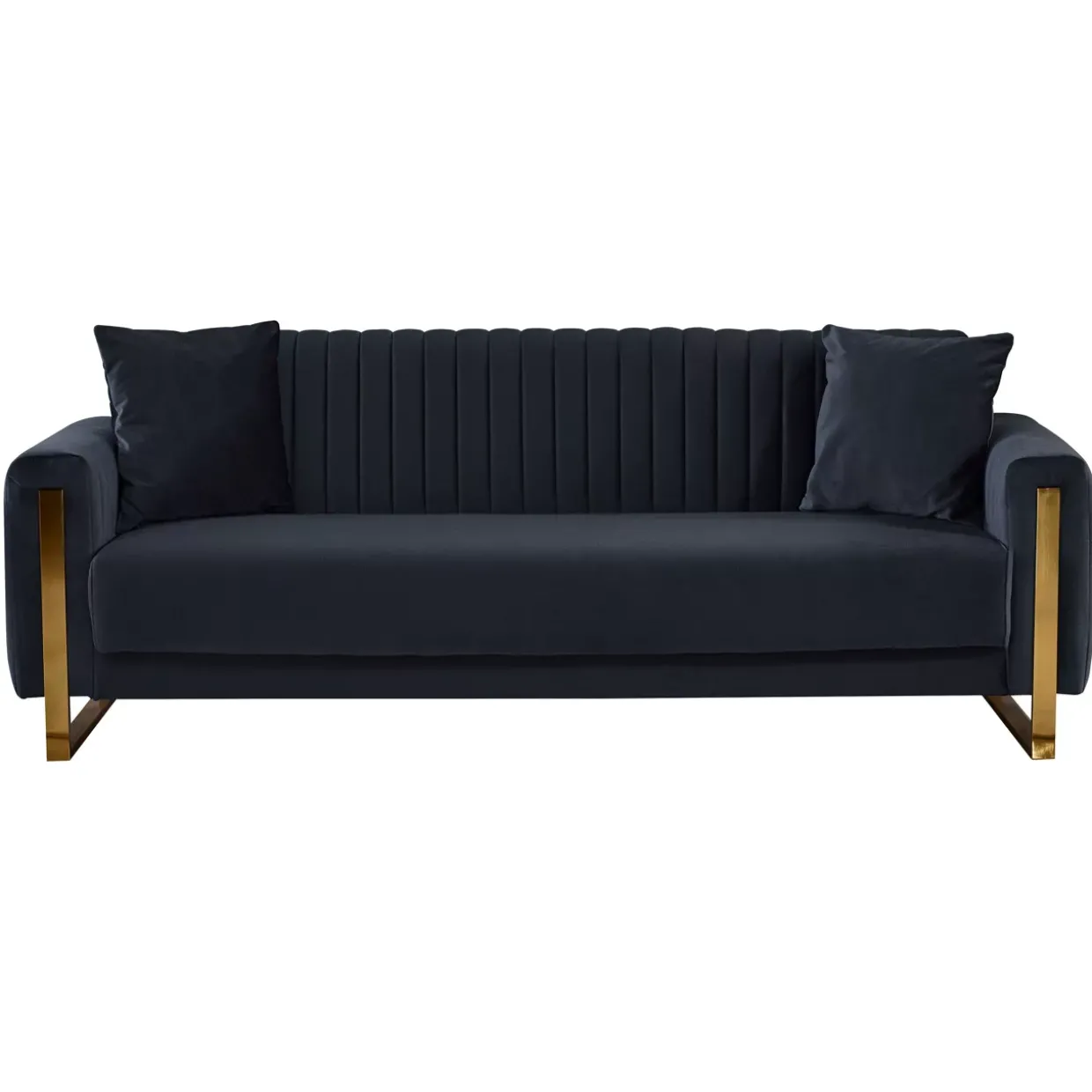 Ein Hauch von Glamour zieht ein mit dem Bogota 3-Sitzer, der in elegantem Soft-Schwarz und goldfarbenen Akzenten erstrahlt. Die Kombination aus Stoff und Metall verleiht diesem Möbelstück eine moderne und zugleich luxuriöse Ausstrahlung. Polyester als Textilart verspricht Langlebigkeit und Komfort, während die Kufen als Fußform einen stabilen Stand gewährleisten.