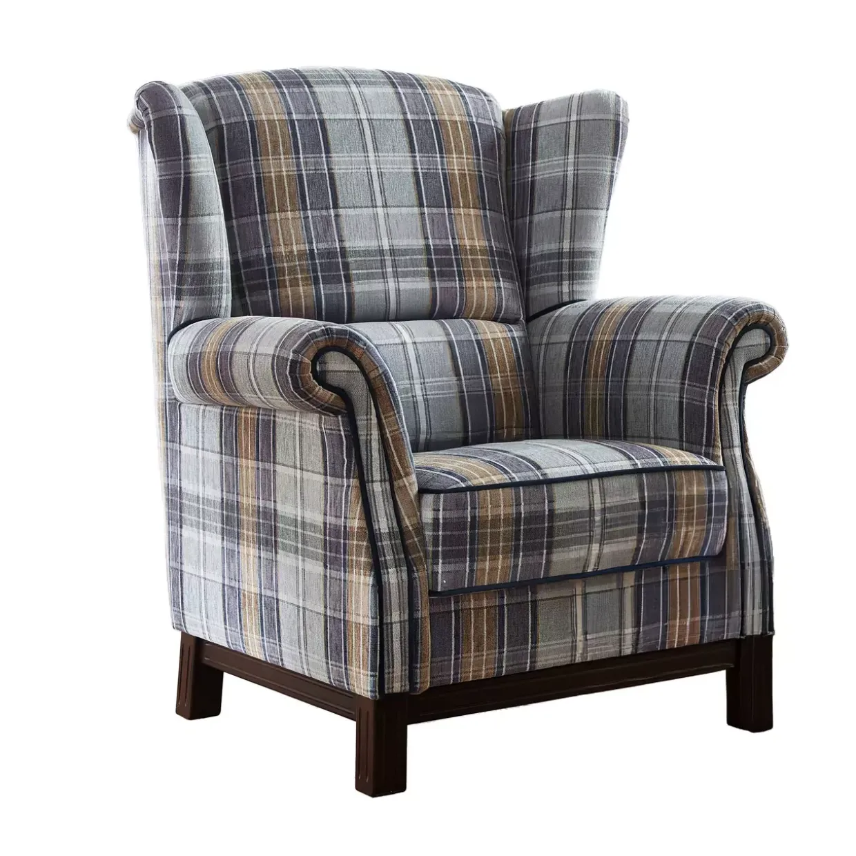 Ein Hauch von Retro trifft auf moderne Eleganz: Der Cambridge Solitärsessel ist ein Meisterwerk der Gestaltungskunst, das mit seinem blau karierten Stoffbezug sofort ins Auge fällt. In Kombination mit der massiven Buche in edlem Maronfarbton schafft er eine warme und einladende Atmosphäre. Der Einsatz von hochwertigem Stoff und robustem Holz unterstreicht die Qualität und Langlebigkeit dieses Möbelstücks.Ein weiterer Pluspunkt ist die komfortable Federkern-Polsterung, die für ein angenehmes Sitzgefühl sorgt. Diese Art der Polsterung bietet eine hervorragende Unterstützung und Stabilität, die über Jahre hinweg erhalten bleibt. Der Echtbezug auf der Rückseite rundet das Gesamtbild ab und macht den Sessel von allen Seiten zu einem stilvollen Blickfang.Besonders in Räumen, die eine Retro-Ästhetik schätzen, fügt sich dieser Solitärsessel nahtlos ein und bietet gleichzeitig eine bequeme Sitzgelegenheit. Die Kombination aus Stoff und Holz verleiht dem Möbelstück eine natürliche Ausstrahlung, die sowohl in klassischen als auch in modernen Einrichtungen harmoniert. Wenn Sie Wert auf zeitlose Eleganz und hochwertige Materialien legen, ist dieser Solitärsessel eine bemerkenswerte Wahl für Ihr Zuhause.