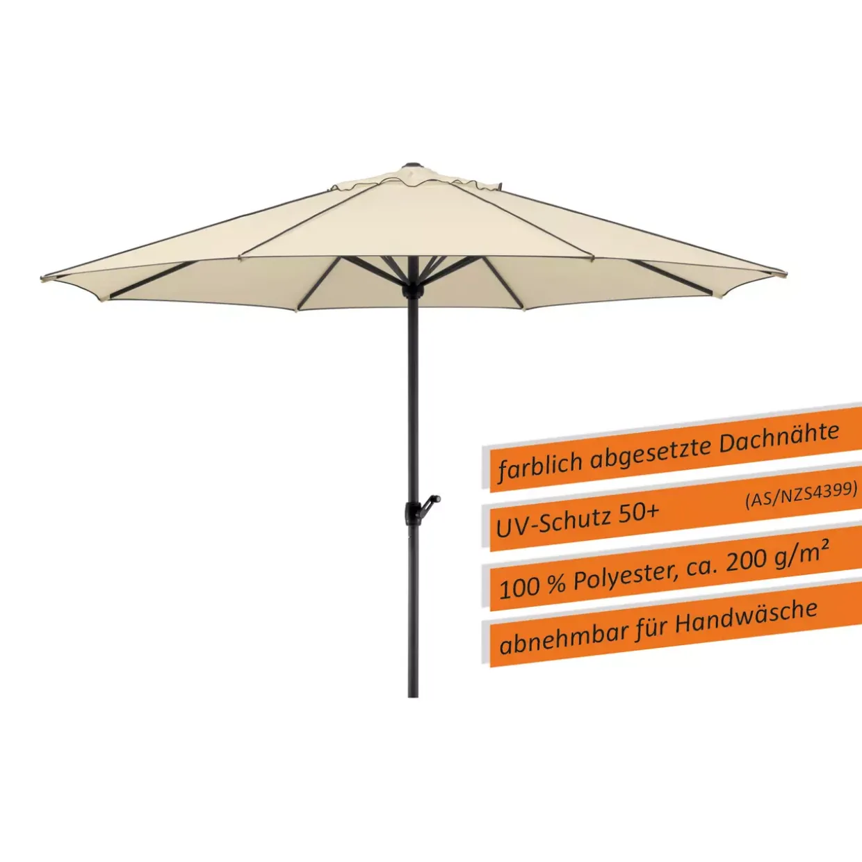 Kombiniert aus Kunststoff und Metall, vereint dieser Sonnenschirm Langlebigkeit mit leichtem Handling. Kunststoffe sorgen für Widerstandsfähigkeit gegen Witterungseinflüsse, während die Metallteile Stabilität und Robustheit gewährleisten. Diese Materialwahl macht ihn ideal für den langfristigen Einsatz im Freien.