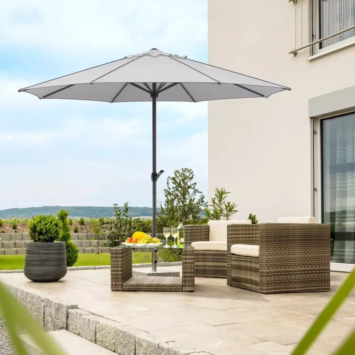 Nicht zuletzt überzeugt der Sonnenschirm durch seine schlichte Eleganz, die mit nahezu jedem Einrichtungsstil harmoniert. So wird er nicht nur funktional, sondern auch zu einem stilvollen Element Ihrer Außenanlage.